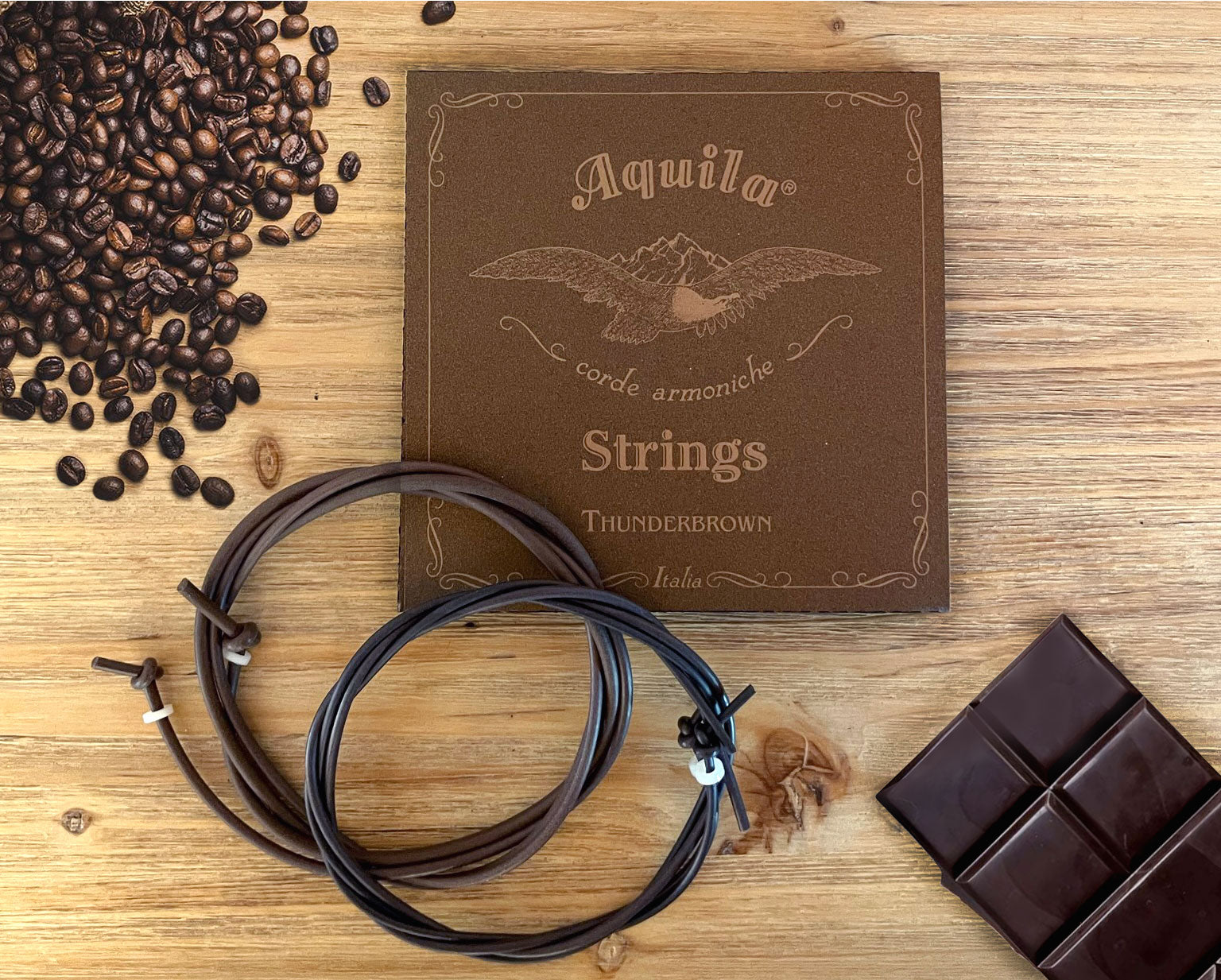 This new line of strings represents the next major innovation in bass string technology from Aquila. Improved feel and higher working tension to facilitate all modern techniques such as slap, slide, bridge sound and harmonics. The sound wants to imitate the low and powerful effect of the double bass so you can use your instrument acoustically even with larger groups. Thunderbrown strings do not show the so called ‘sausaging effect‘ (strings pulled by hand change their diameter permanently). They are made from plant-derived bio-elastomers. The metal added to the plastic blend in micronised copper form is minimal in the first string and maximal in the fourth string: this ensures perfect acoustic homogeneity of the set. The strings guarantee perfect finger slide on the left hand. The diameter is small enough to be comparable to standard wound strings of the acoustic bass guitars. The sound is so powerful that they can be installed on instruments with traditional soundboard (i.e. not solid top) and played without amplification. The string tension has been increased compared to that of our Thundergut, Thunderblack and Thundered strings.