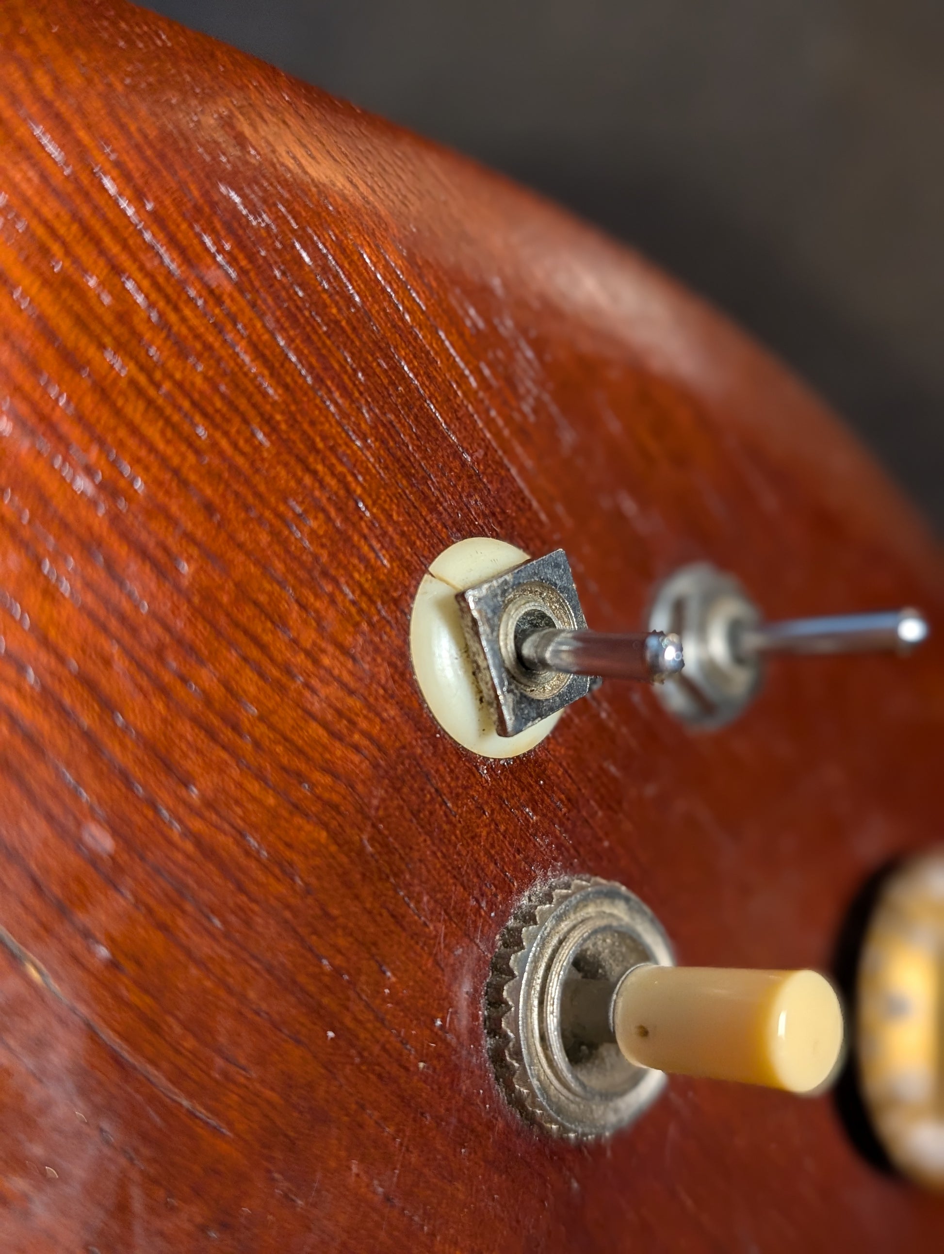 This guitar is in very good condition with minor cosmetic wear. A full setup has been done and it is currently strung with 10-46 strings. All hardware and electronics are working well with no issues. The frets are original and have some wear but still have a good amount of life left. There is a small plastic washer under one of the mini toggle switches but otherwise everything seems to be original. A basic hardshell case is included.