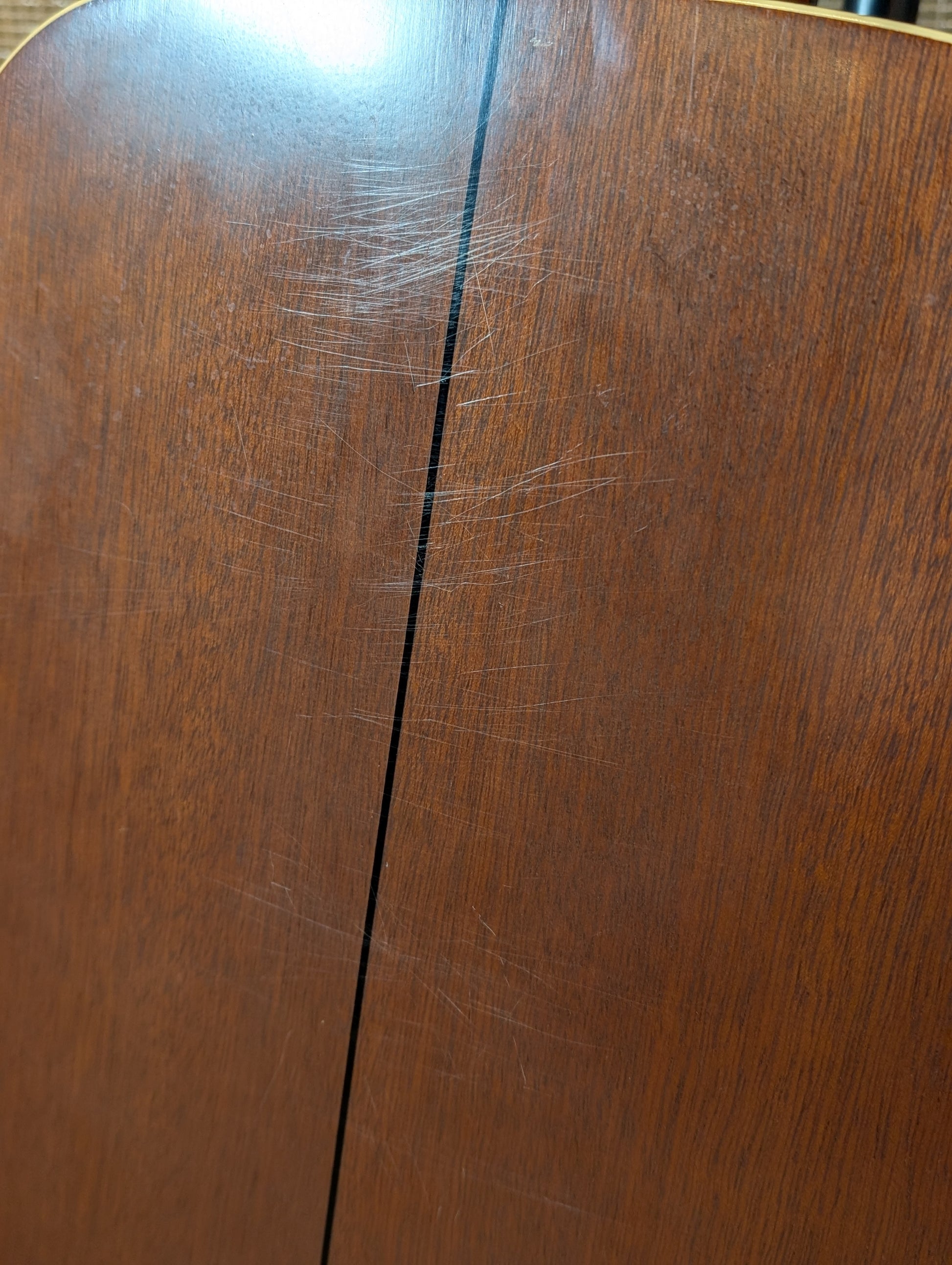 This guitar is in good condition with some noticeable wear and a repaired bridge & crack. The hardware and parts are in good working condition and the frets have a good amount of life left. The bridge was lifting from the body when we received the instrument, this has been repaired by our techs and is holding great. The lifting bridge also caused a crack to form which was also repaired and holding with no issues. A full setup has been done and the guitar is currently strung with light gauge strings. This instrument does not include a case.