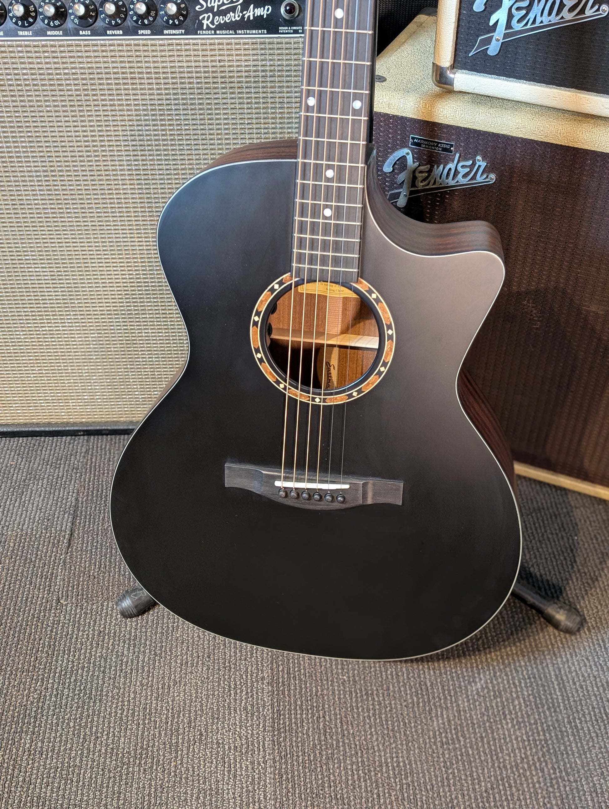 The Eastman AC122-2CE-BK Grand Auditorium acoustic-electric guitar is a versatile guitar shape that is equally suited for both finger picking and strumming.
