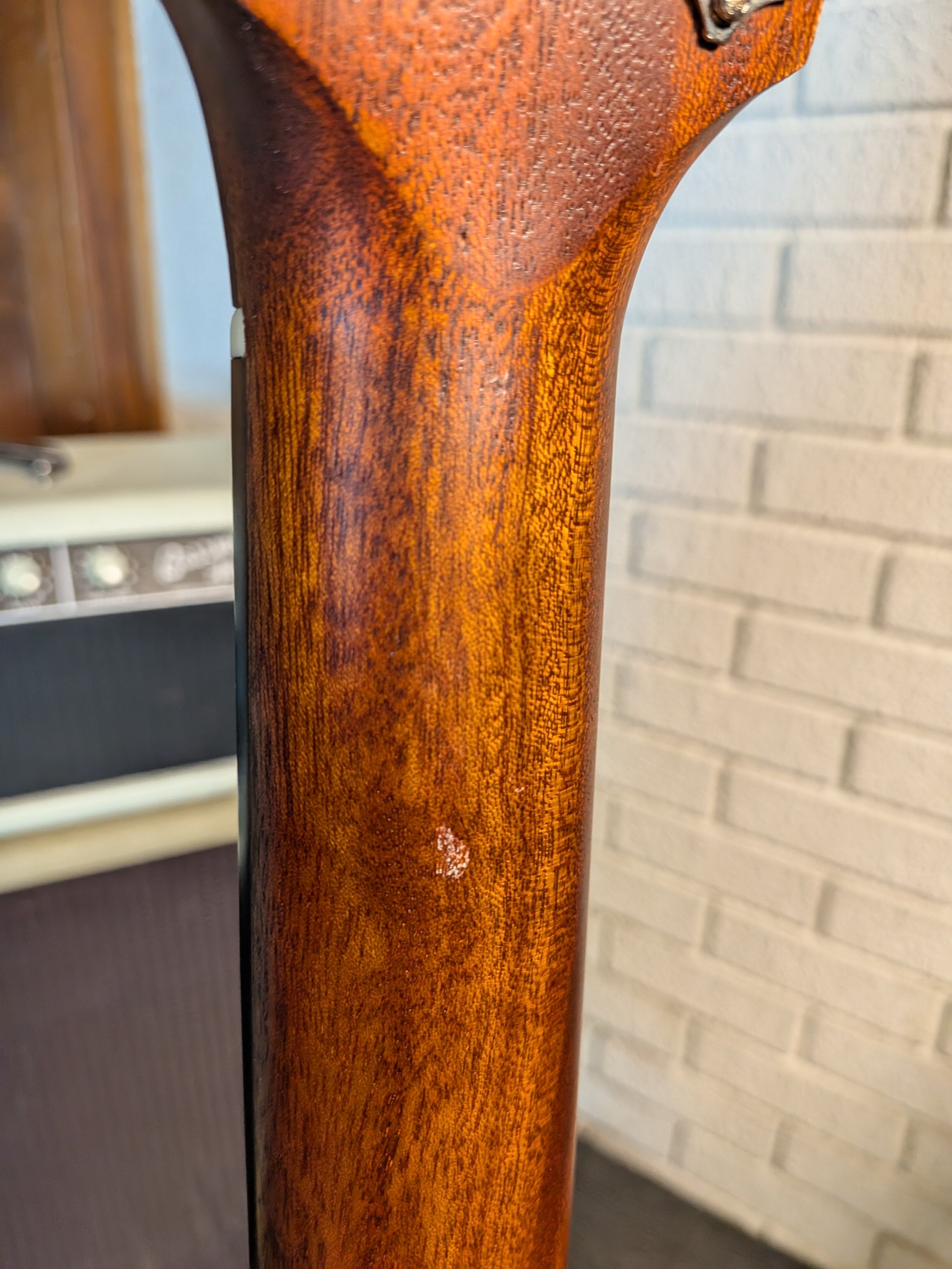 This is a B-stock instrument. All visible blemishes have been photographed and are cosmetic only. In this case the only visible blemish we can find is a small discolored patch on the back of the neck that is visual only and can't be felt while playing. B-stock instruments come with a 90 day in store warranty.