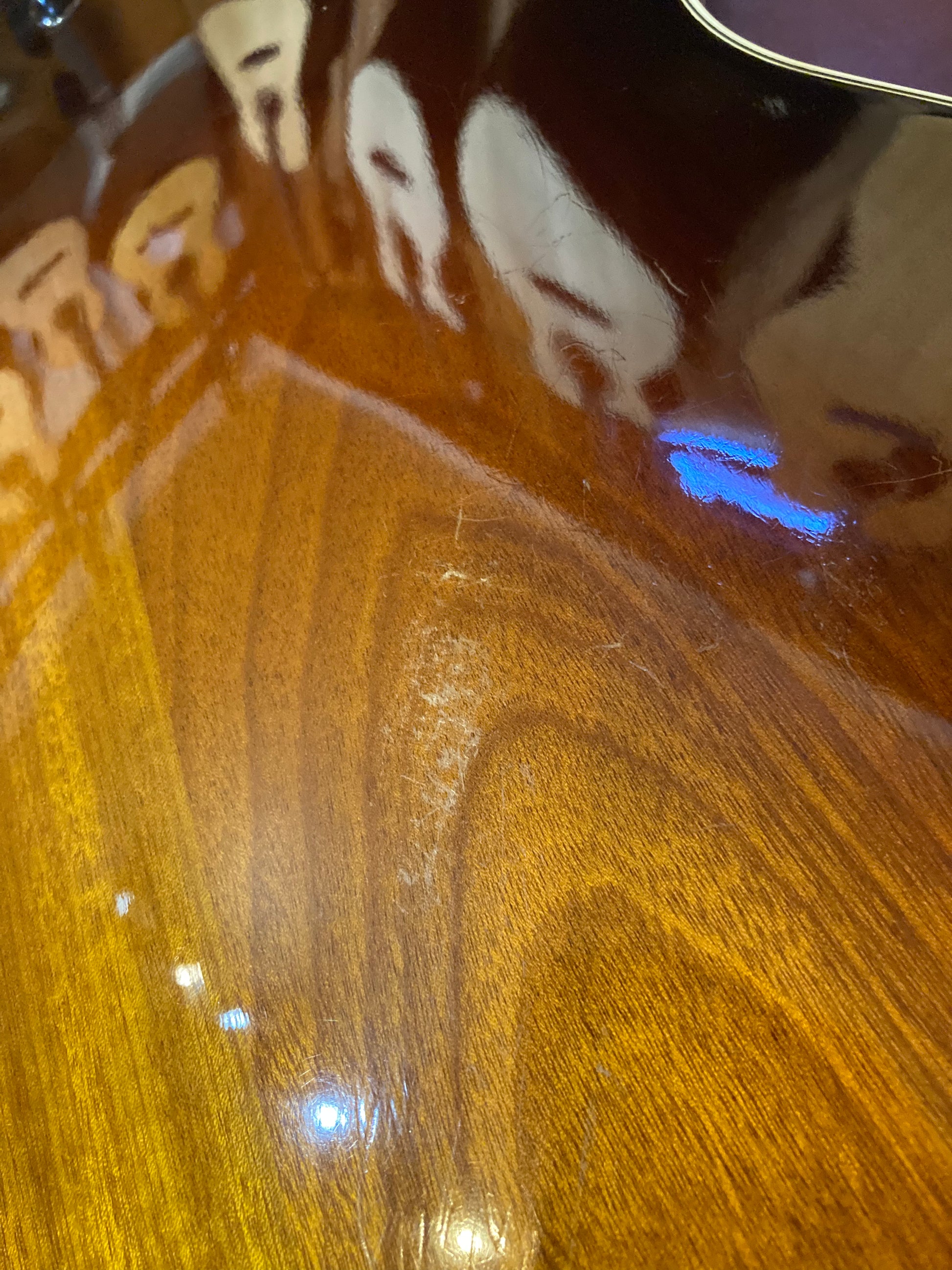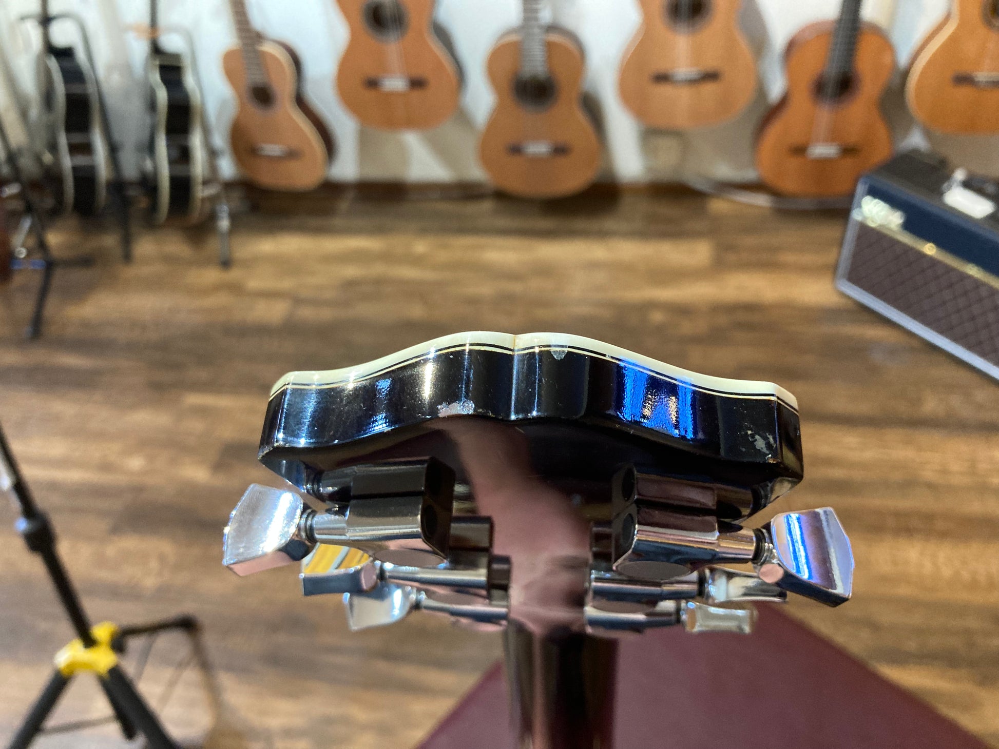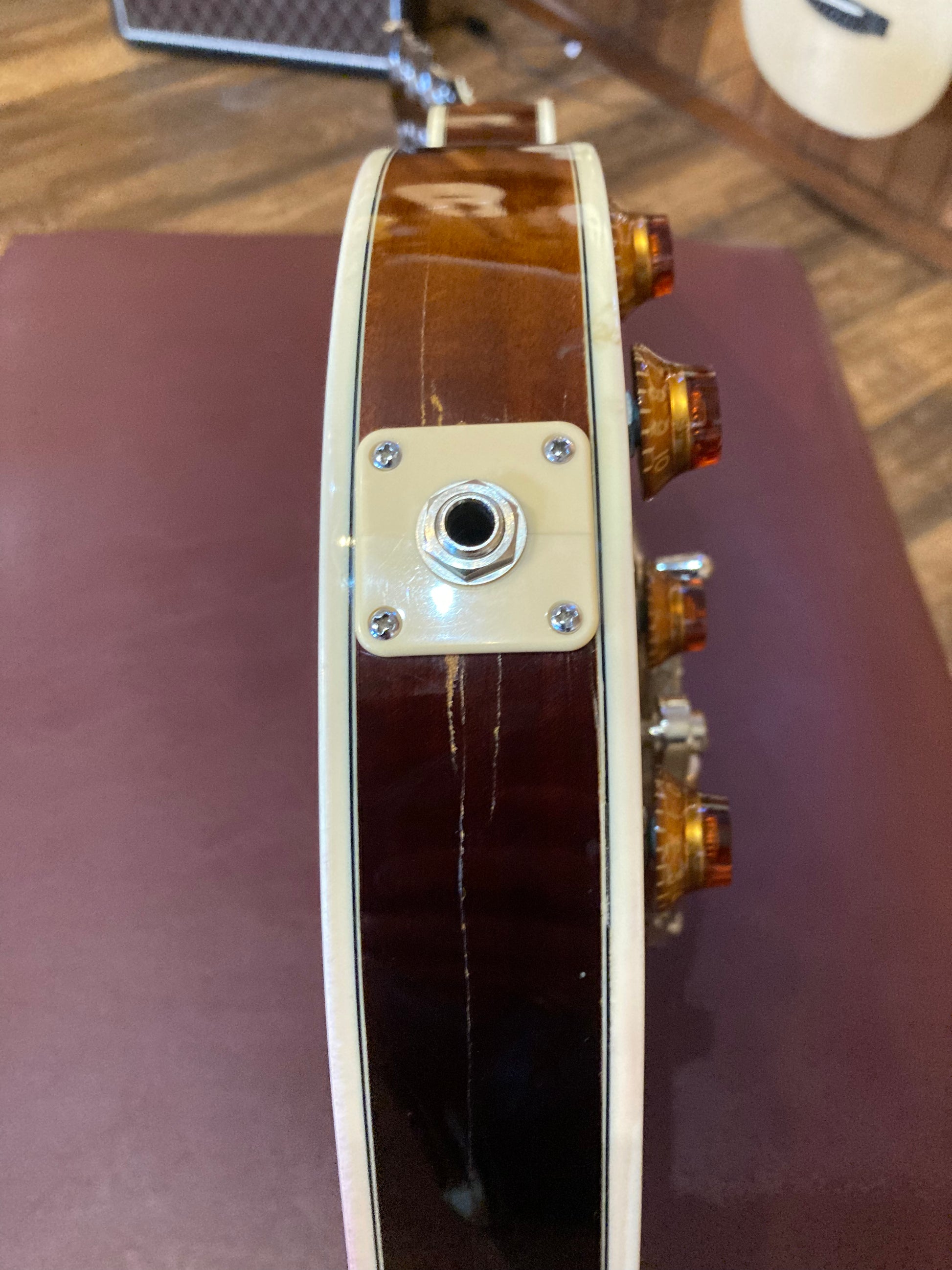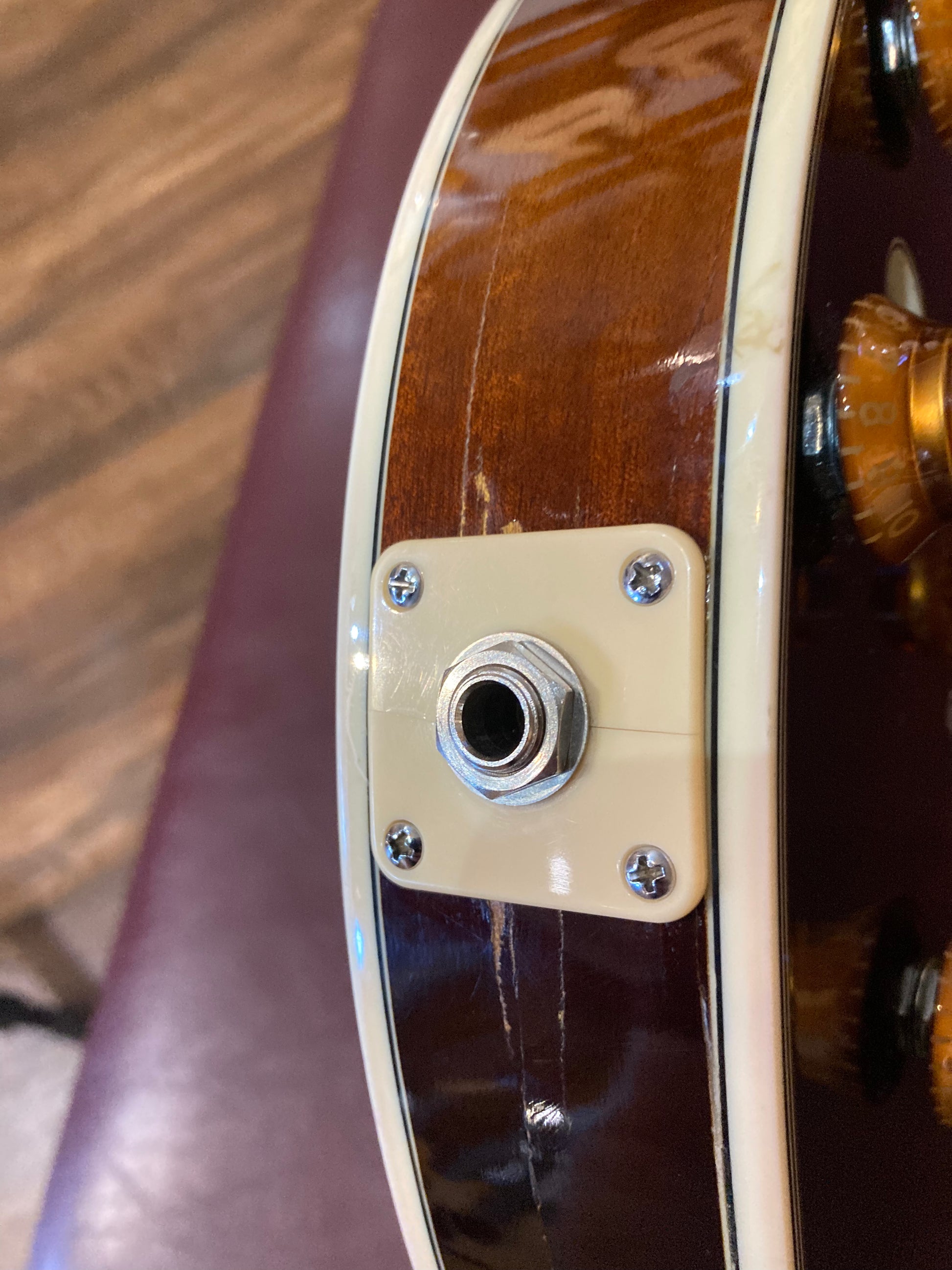 This guitar is in good condition with some cosmetic wear and a repair by the jack. At some point the original jack was damaged and some cracking occured around it. Our techs added a jackplate and glued up the cracking and while they are visible they are holding well.