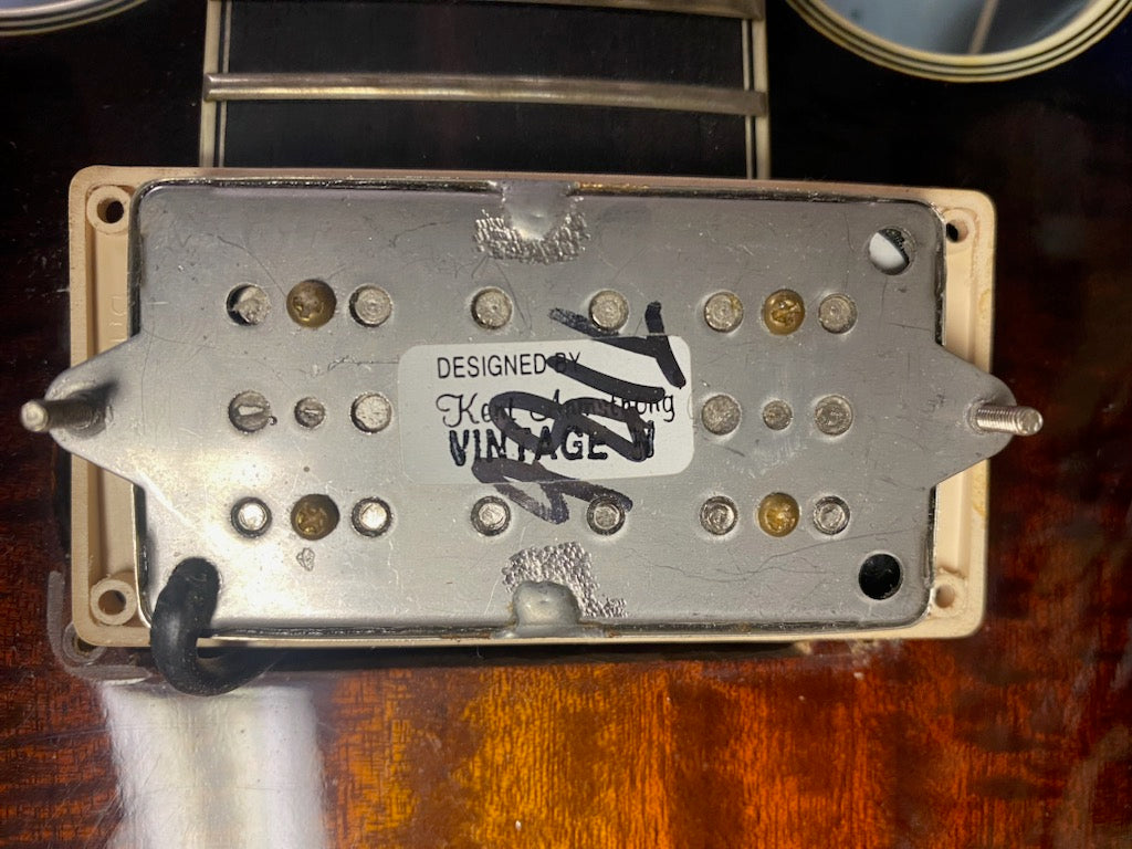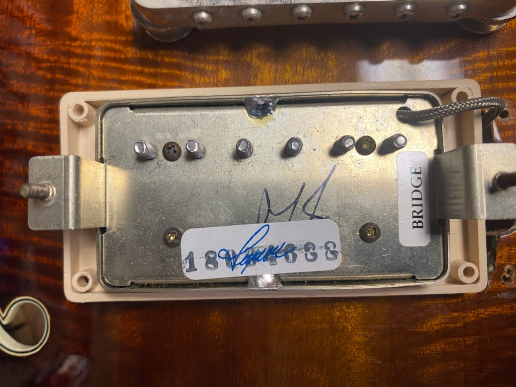 Features a solid maple top, solid mahogany sides/back, Gotoh tuners, ebony fingerboard, mahogany neck, block inlays, aftermarket Seymour Duncan Antiquity bridge pickup and a stock Kent Armstrong neck pickup.