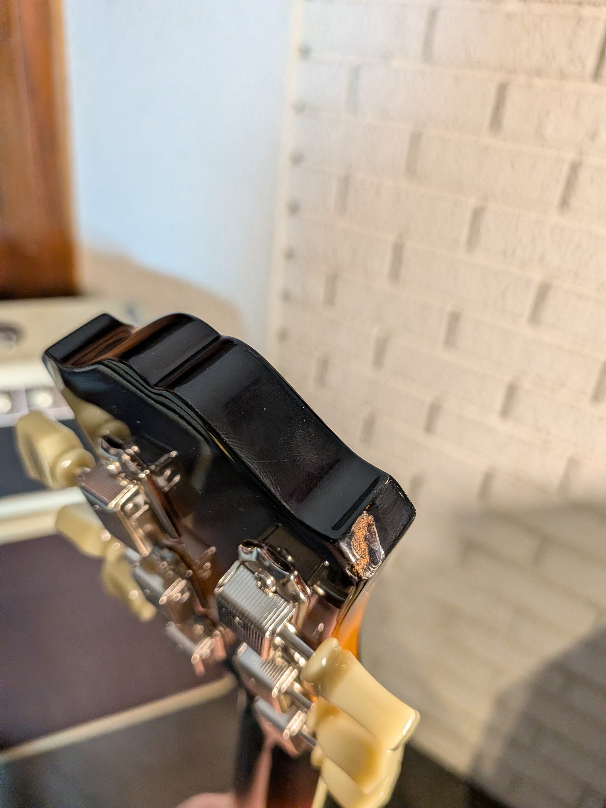 This is a b-stock instrument. All visible blemishes have been photographed and are cosmetic only. In this case, the blemish is a noticeable ding on the top of the headstock. B-stock instruments come with a 90 day in store warranty.