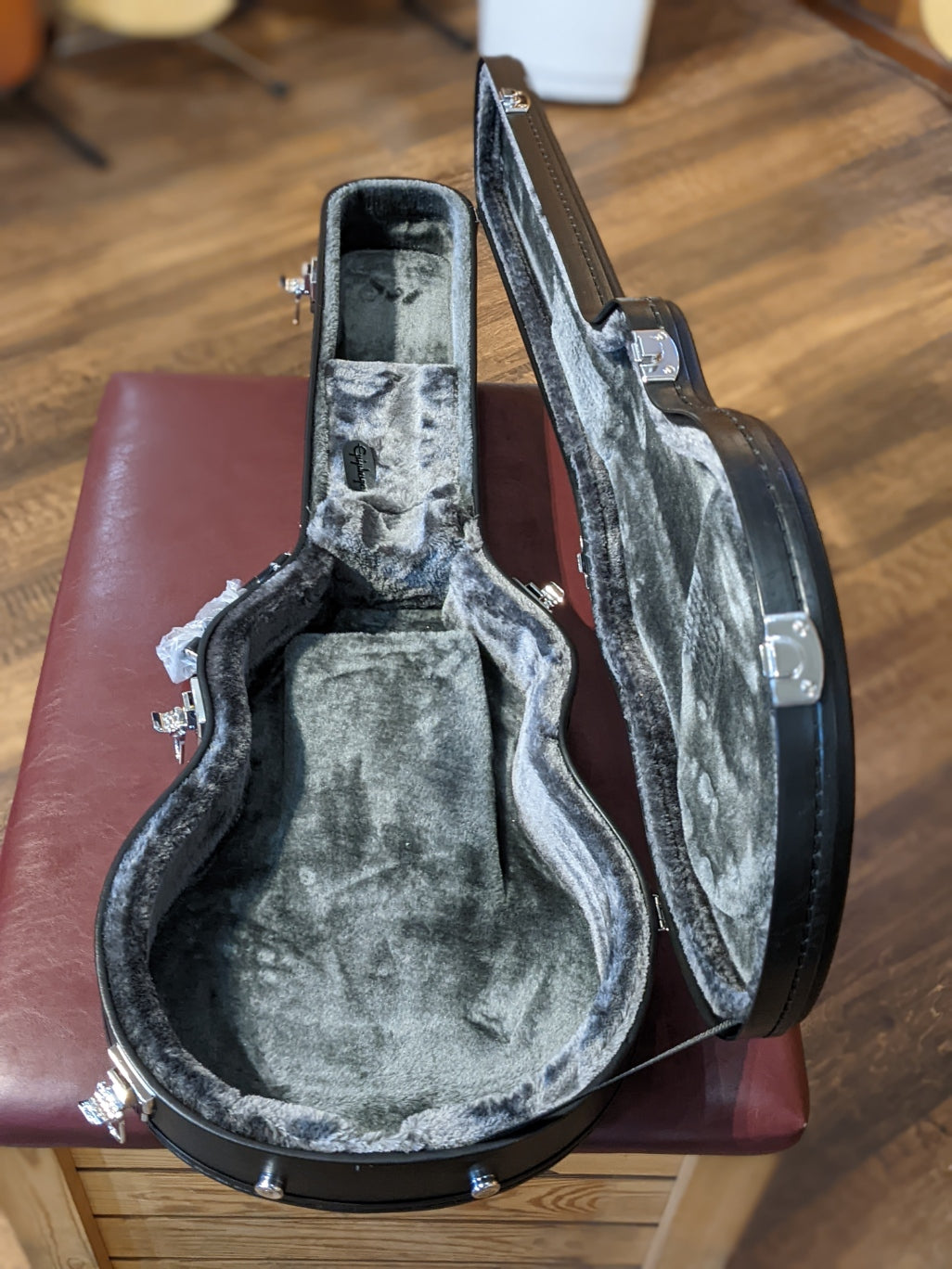 logo on the rear of the headstock. A custom hardshell case is included.