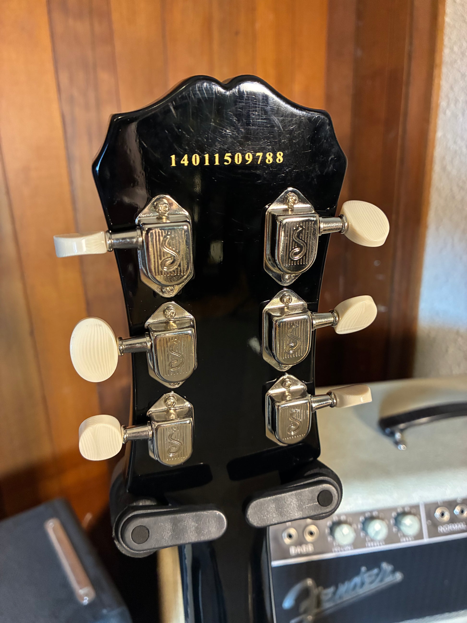 This guitar is in good players shape with minor cosmetic wear. At some point it was outfitted with an aftermarket black vinyl stripe on the bod. All parts and electronics are working well and the frets are in good shape with plenty of height left.