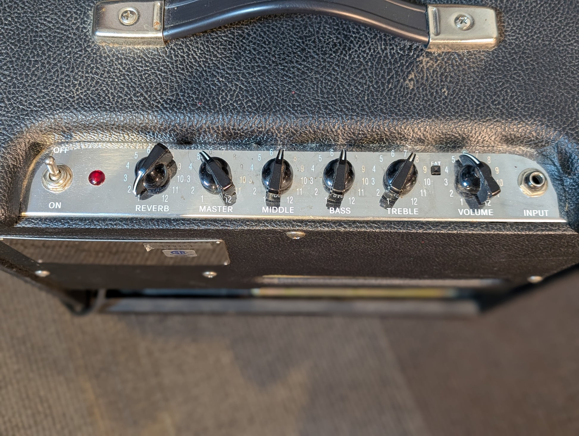 Controls: Reverb, Master, Middle, Bass, Treble, Fat Switch, Volume