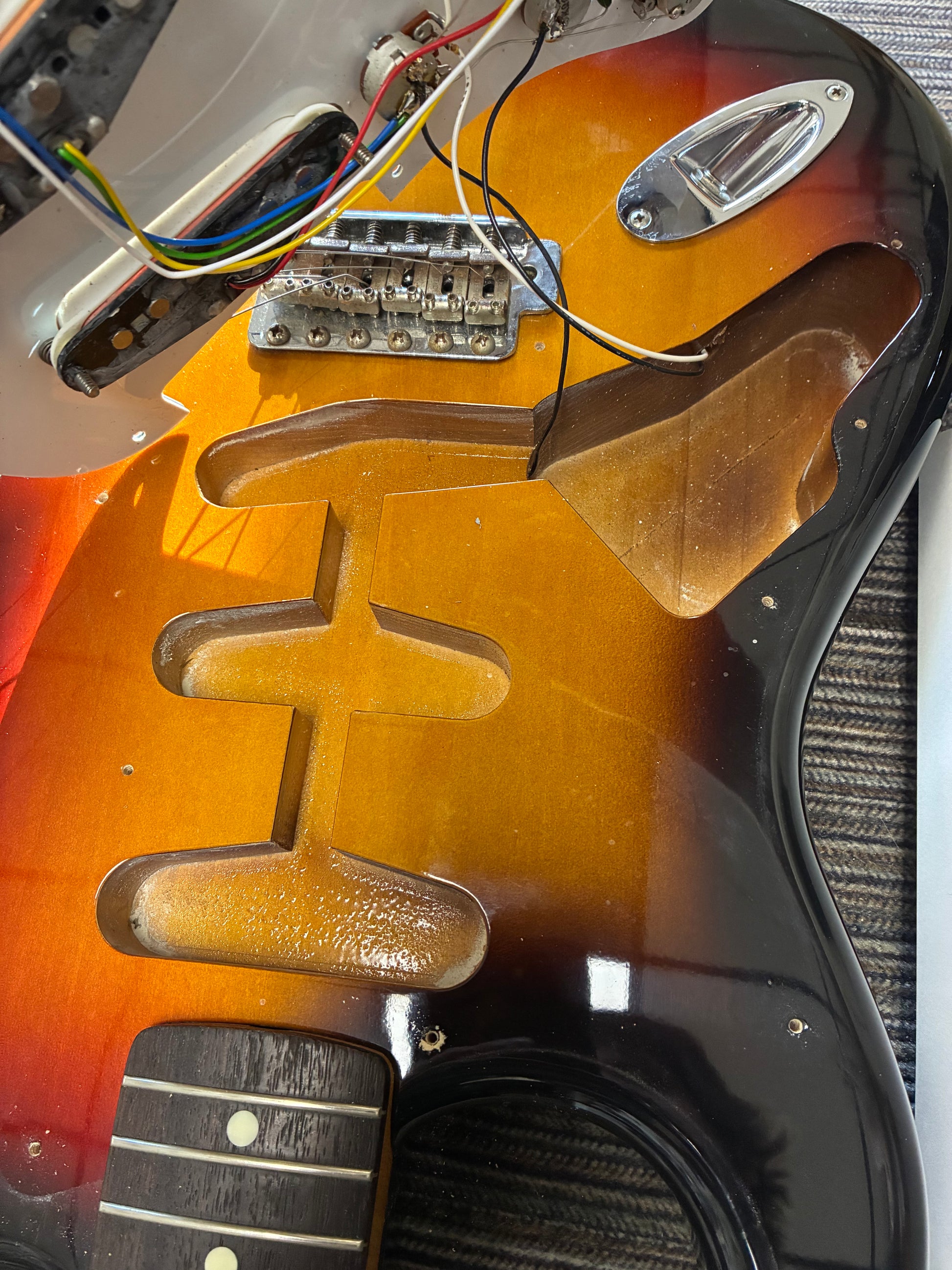 It appears to be all original and is currently playing well with low action and light gauge strings. There is some minor cosmetic wear and some corrosion on the bridge but otherwise it is structurally solid with no issues. The frets are also in very good condition with only minor wear. The original molded hardshell case is included.