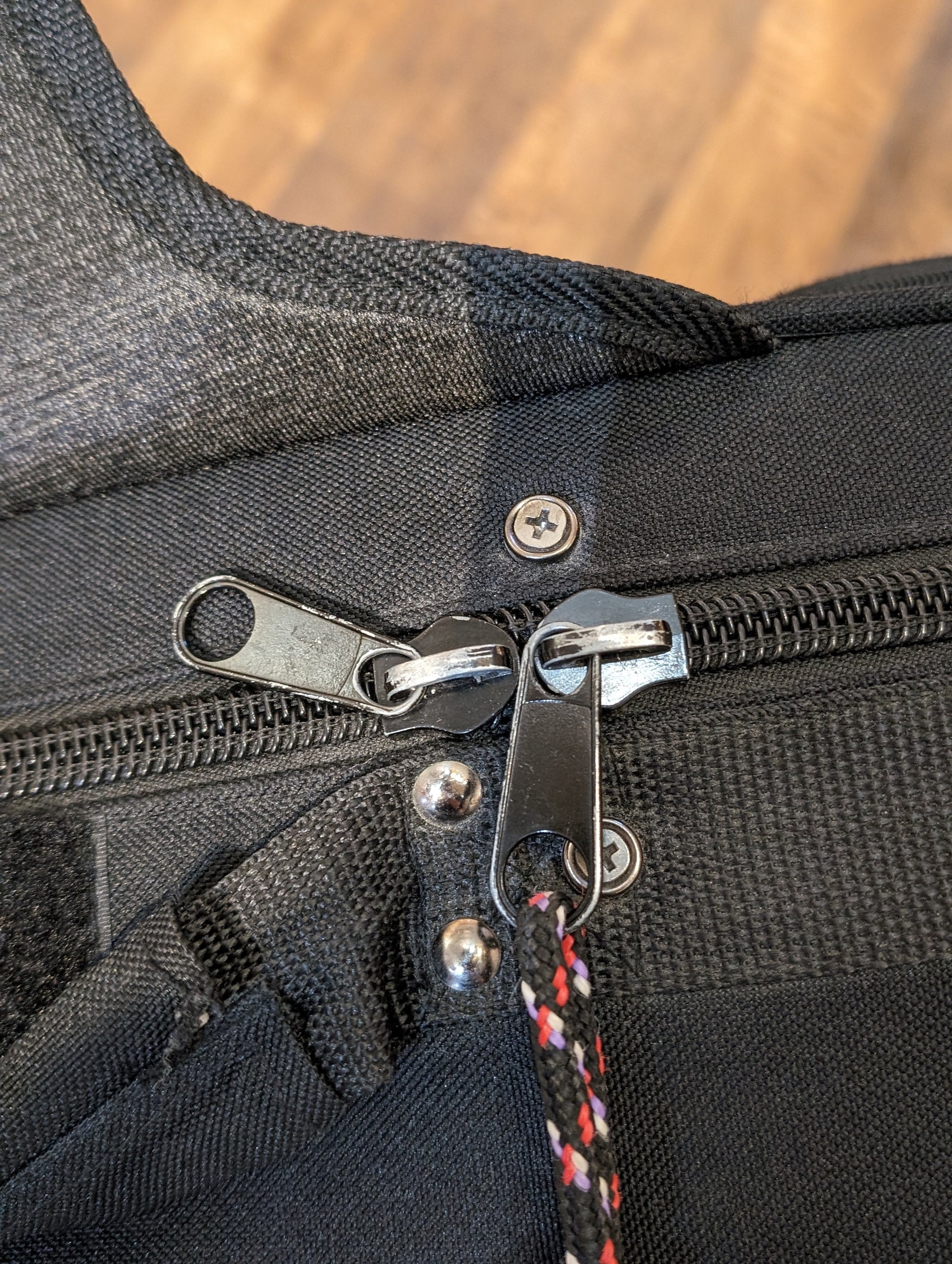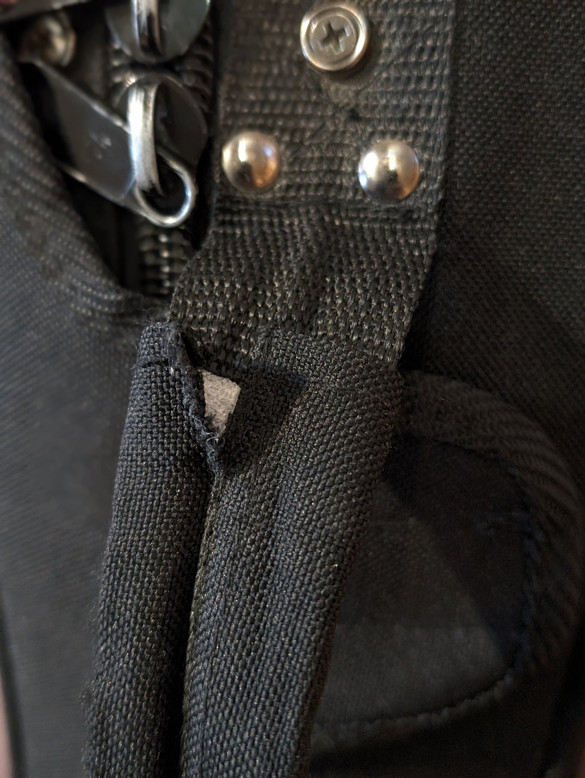 This case is in very good condition with some minor cosmetic wear. All zippers are still working as they should. The back straps are not included.