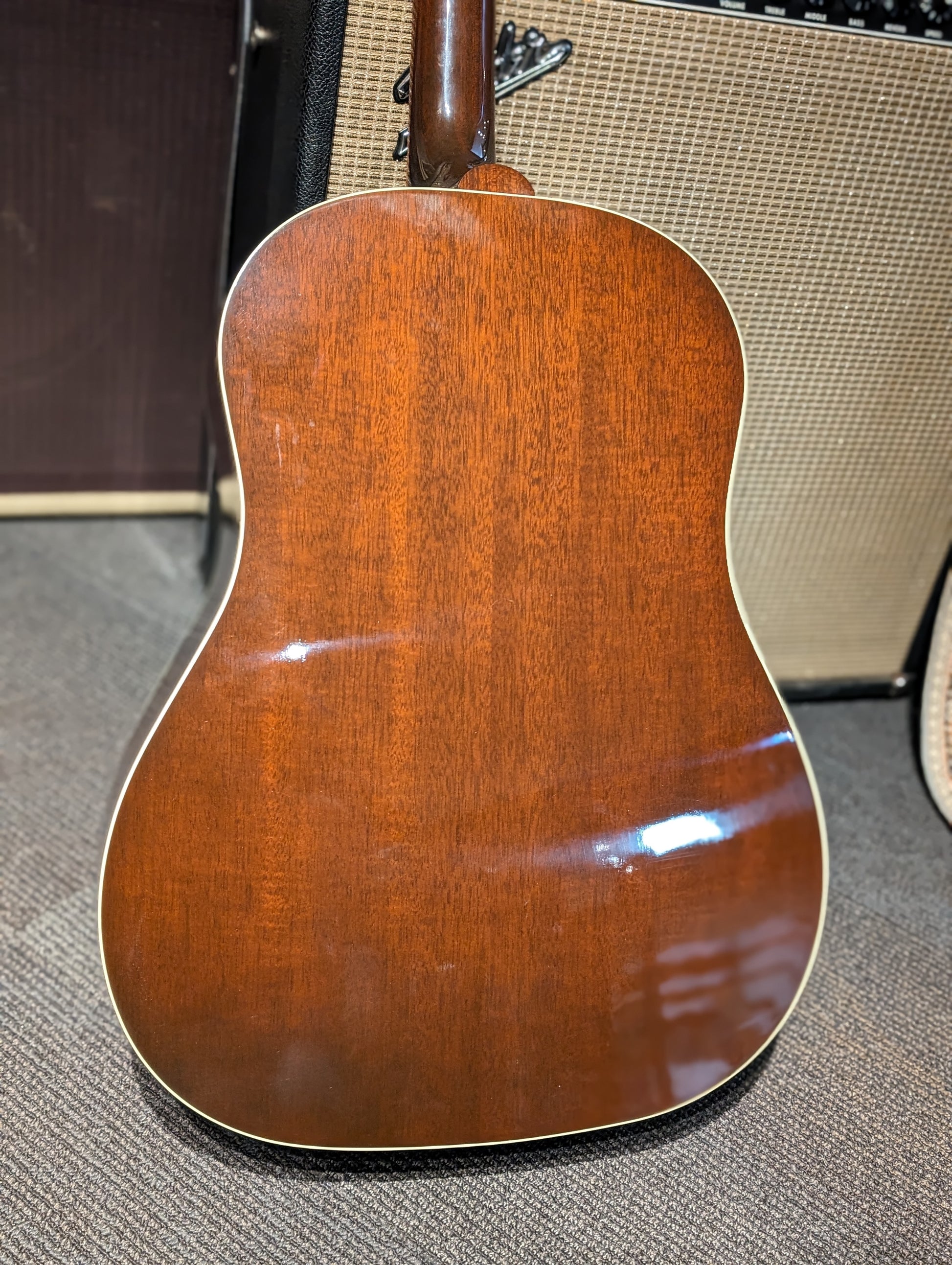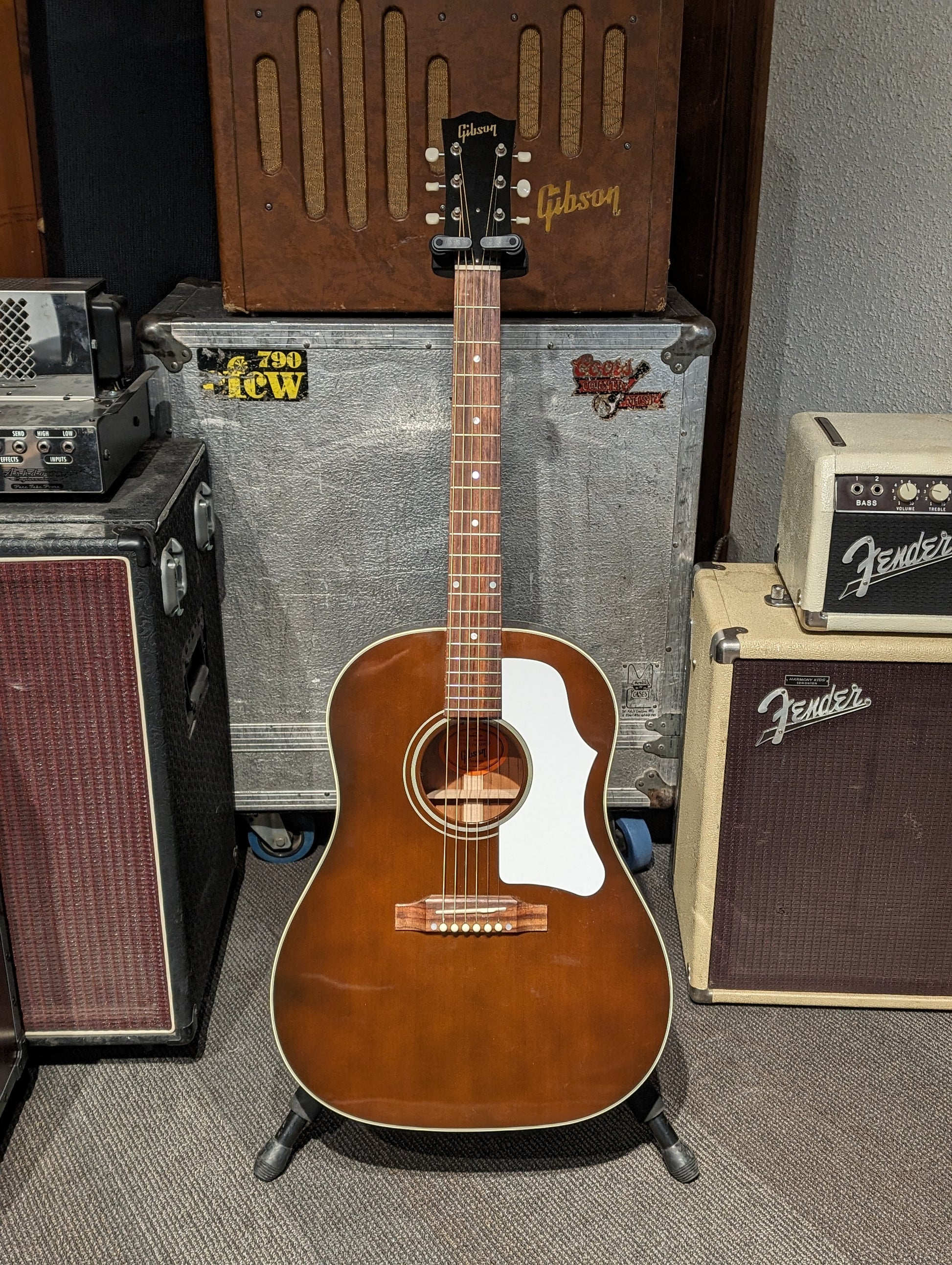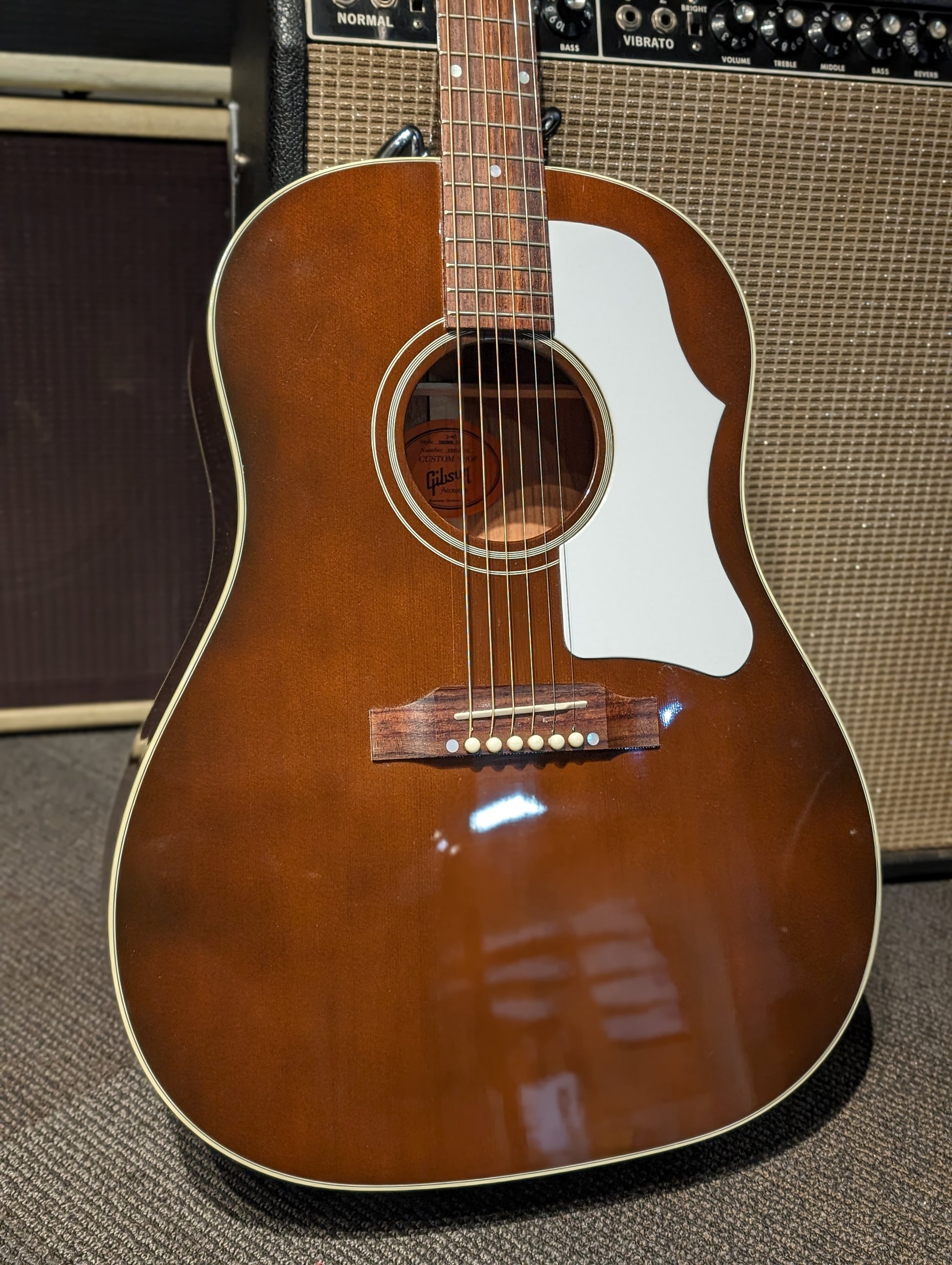The J-45 is one of Gibson's best-selling acoustics of all time. Nicknamed The Workhorse and first introduced in 1942, this popular acoustic is now the icon of Gibson's round-shoulder, dreadnought line. The Early 60's Brown Top is highlighted by a rare custom finish and 1960s era appointments. Including Grover strap button tuners, white pickguard. Upgraded with an LR Baggs Element pickup for optimum plug and play ease.