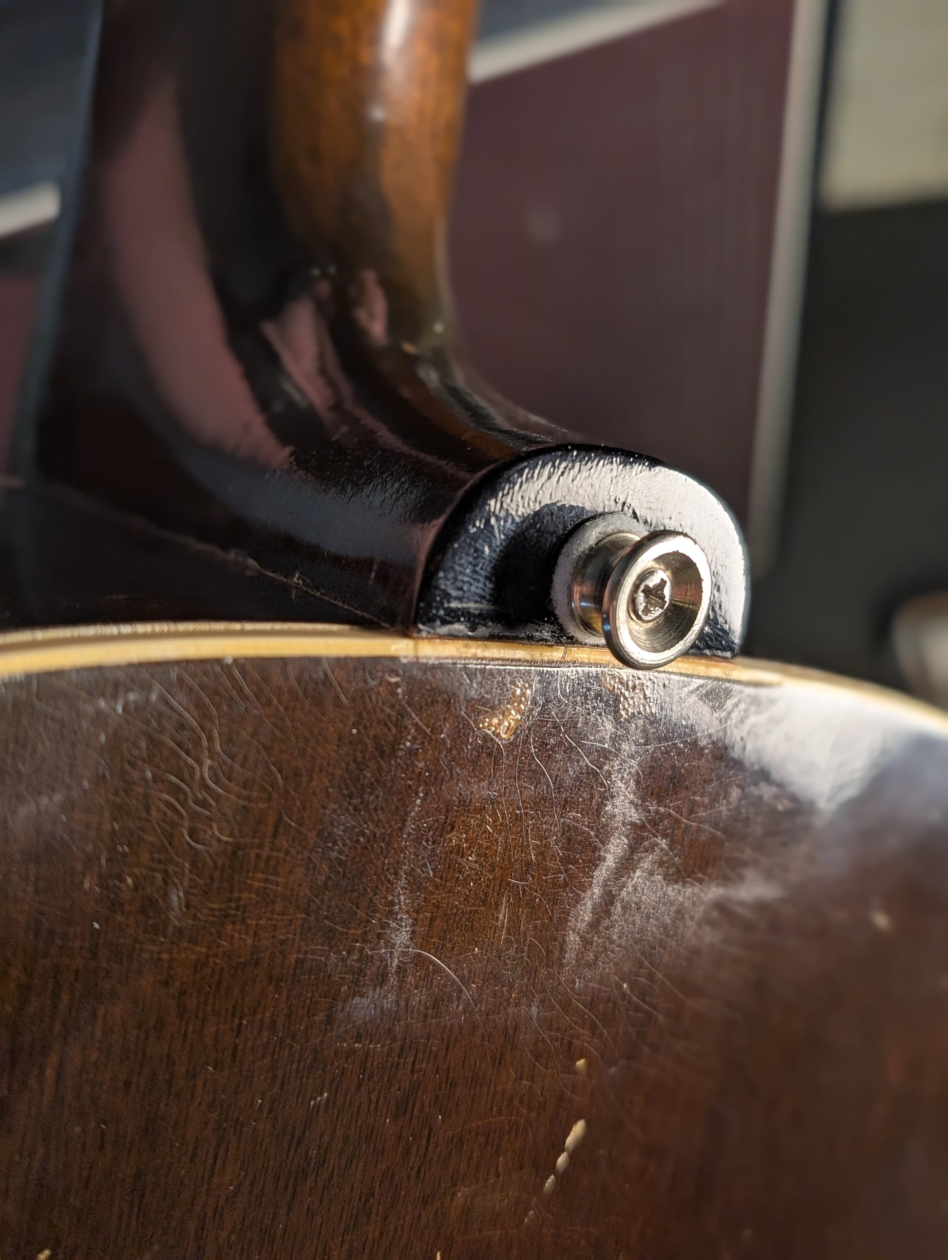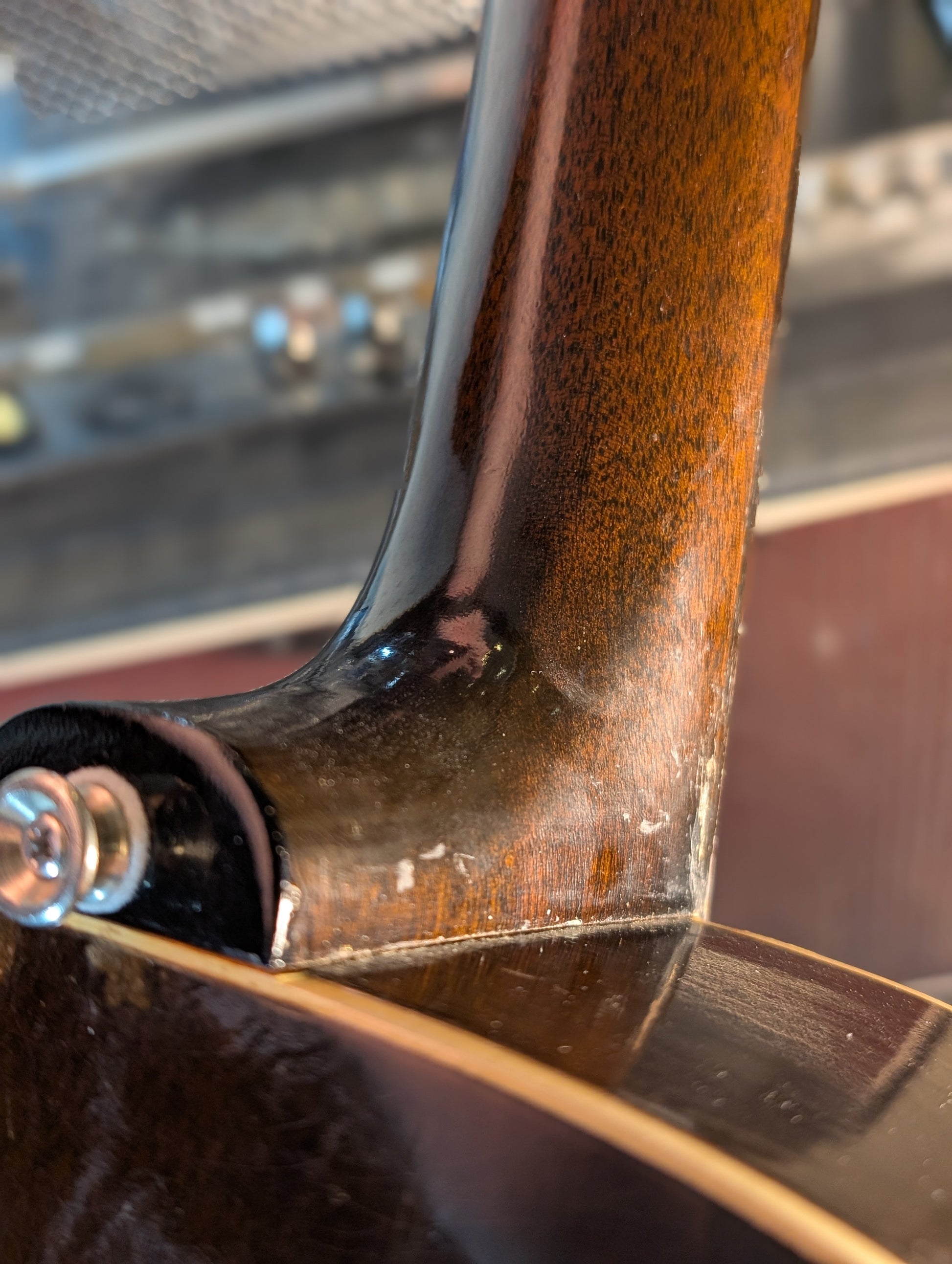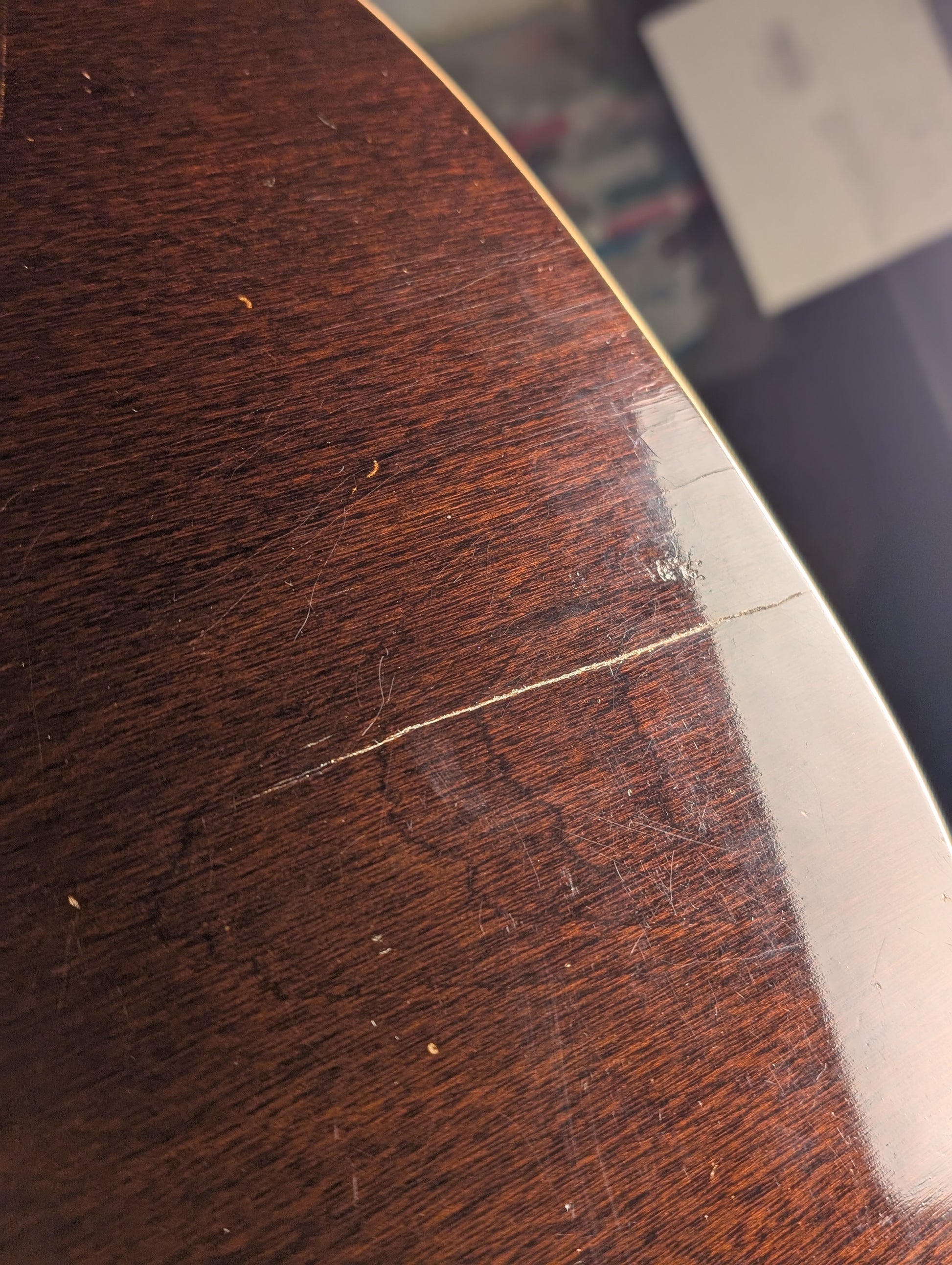 This guitar is in fairly good condition considering its age, with some visible cosmetic wear and some repaired cracks. The neck joint is in very good condition with a proper neck angle and the frets still have lots of life left. There are 4 repaired cracks in the top and one on the back, the repairs were done a long time ago and look to be holding well. The tuners are original and working well. With this guitar being a Hawaiian conversion the nut has been changed from the original extra tall one to a standard bone nut, the saddle also looks to have been replaced at some point with the new one also being made of bone. A vintage case is included and while we can't tell for sure if it's original it is era correct.