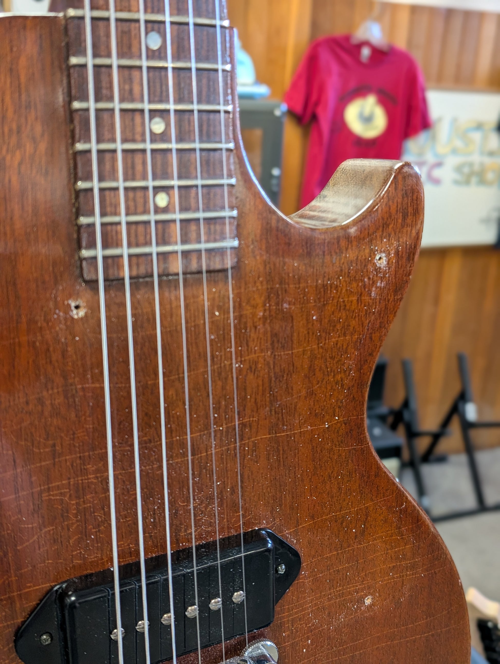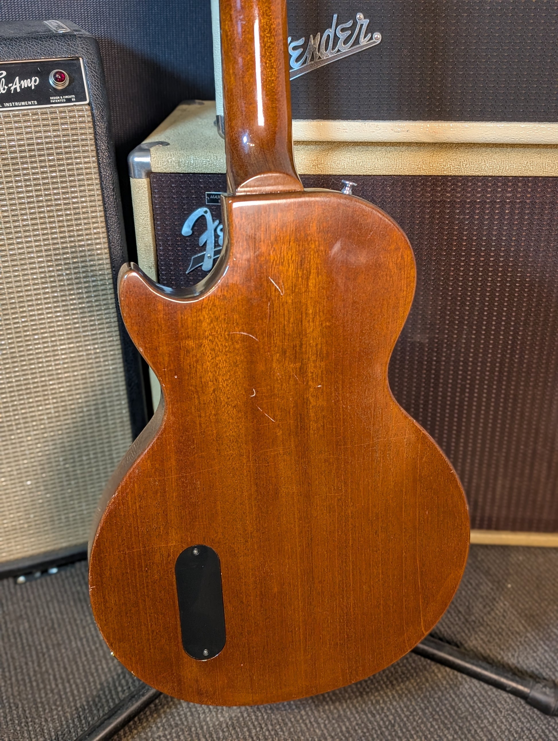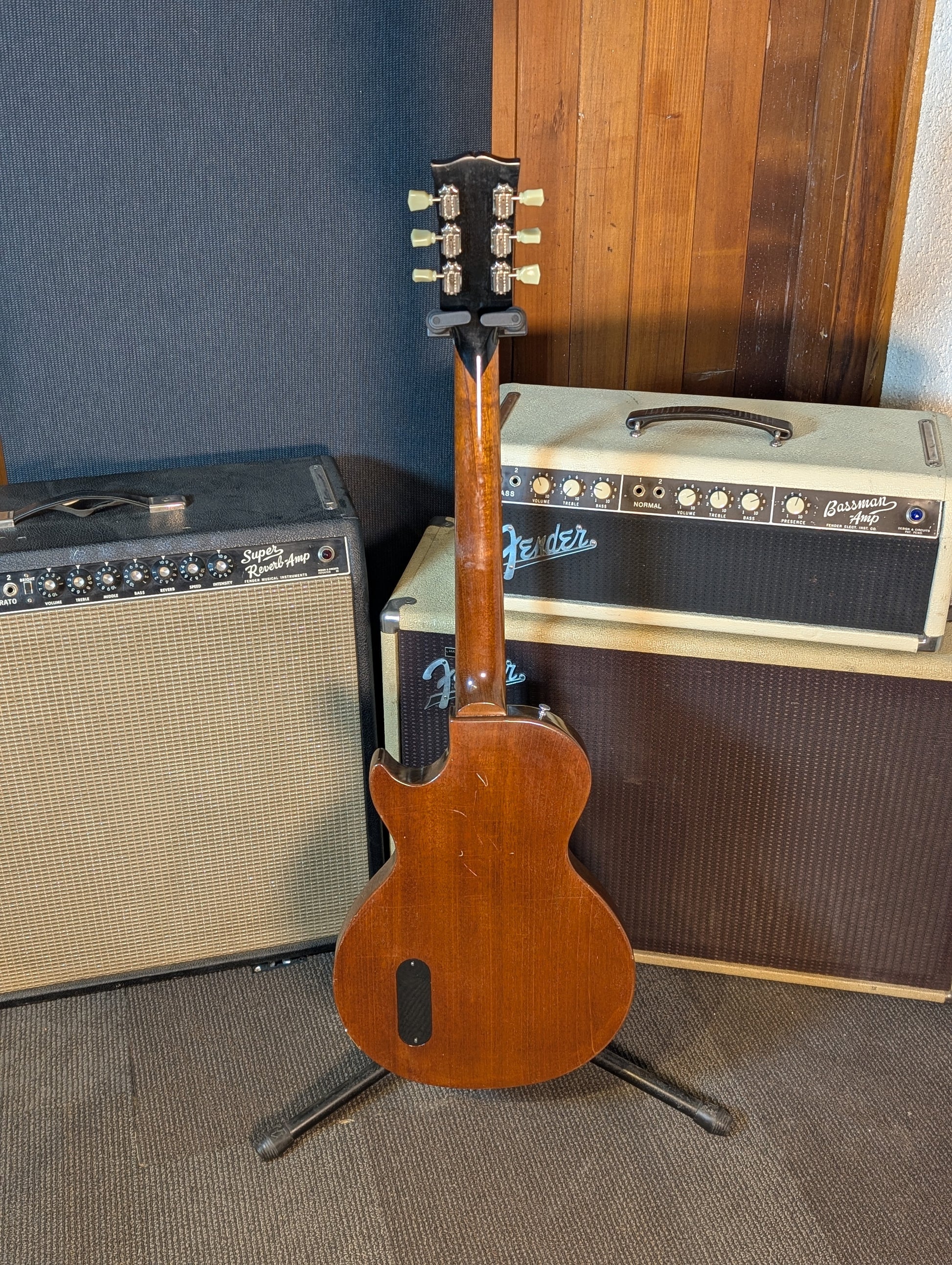 This guitar is in very good condition with some wear and what looks to be a repaired headstock break. Based on what we can make out on the serial we believe this to be a 1990 Les Paul Junior with either a very well done re-finish to the brown mahogany or potentially a special limited run. These models originally had a black pickguard, the pickguard on this specific guitar is cream and may or may not be original to the guitar. The pots, wiring and pickup look to all be original and working well with no issues. The back of the headstock has had a black stinger painted over most likely to cover a headstock repair or defect. The paint job was done very well and there is nothing feel wise at headstock and at the nut that affects the feel and playability of the guitar. The tuners look to also have been replaced with Grover Deluxe heads, originally this guitar had a Grover mini heads. A 1980's brown rectangular Gibson case is included with the guitar.