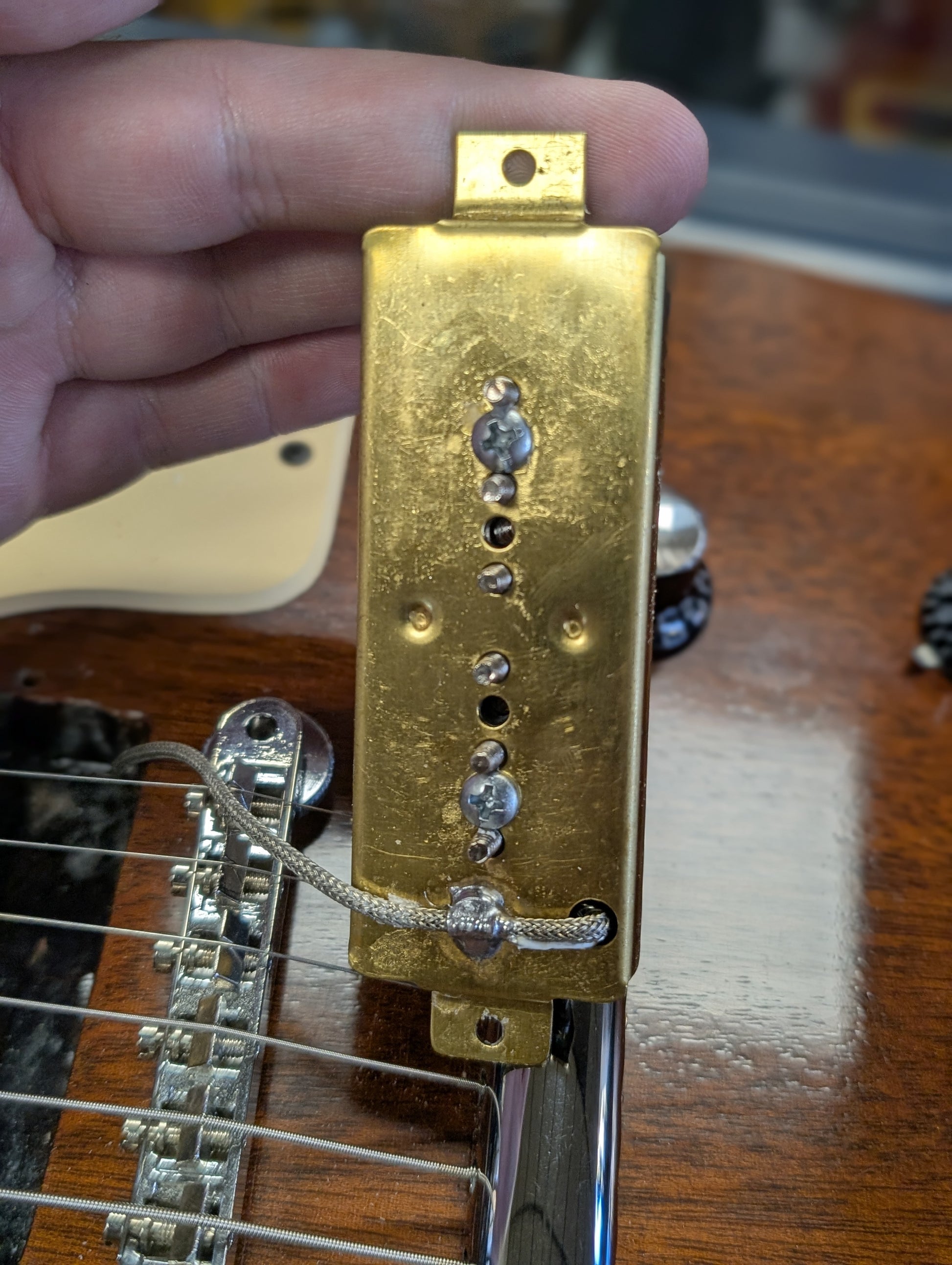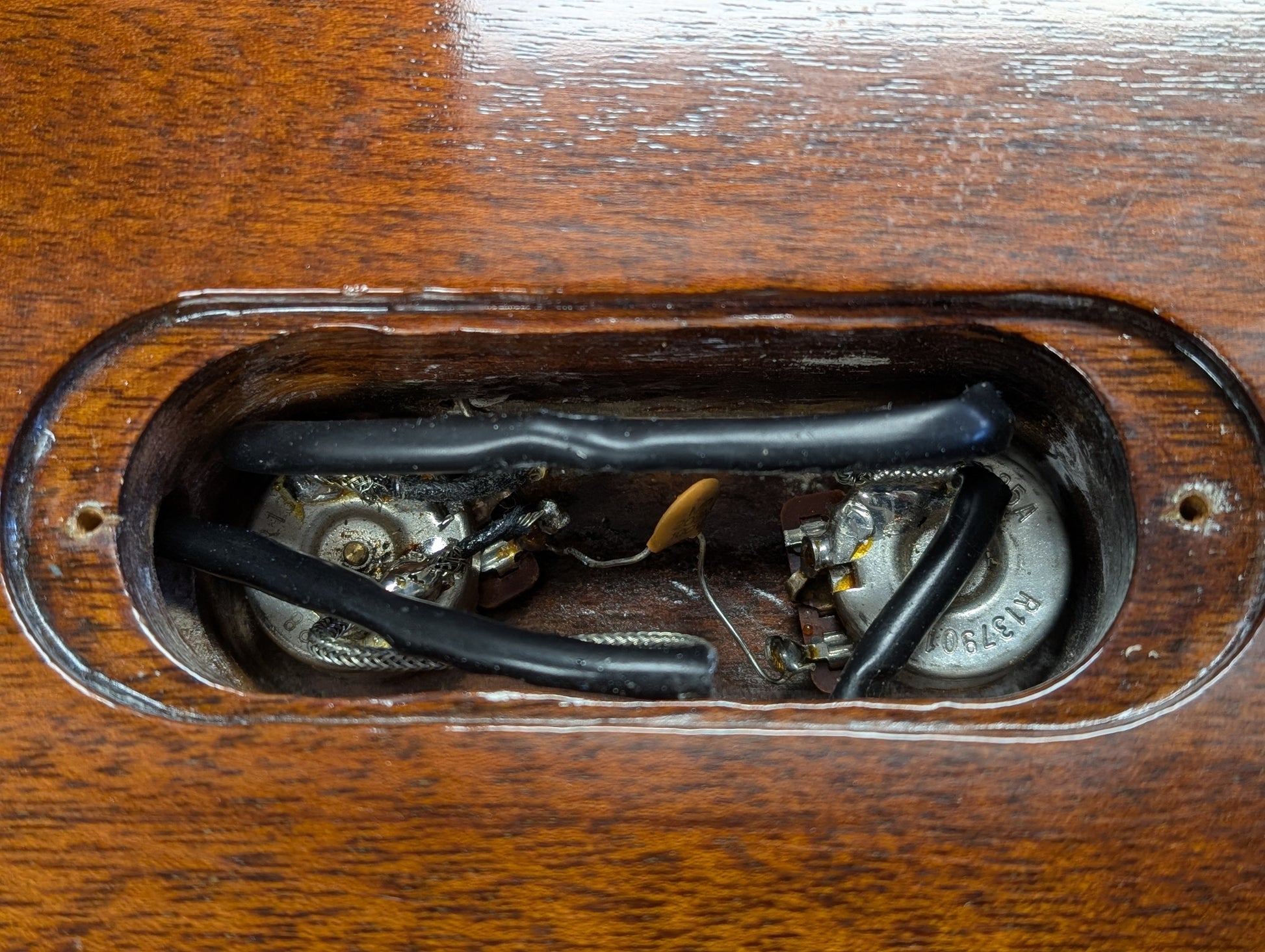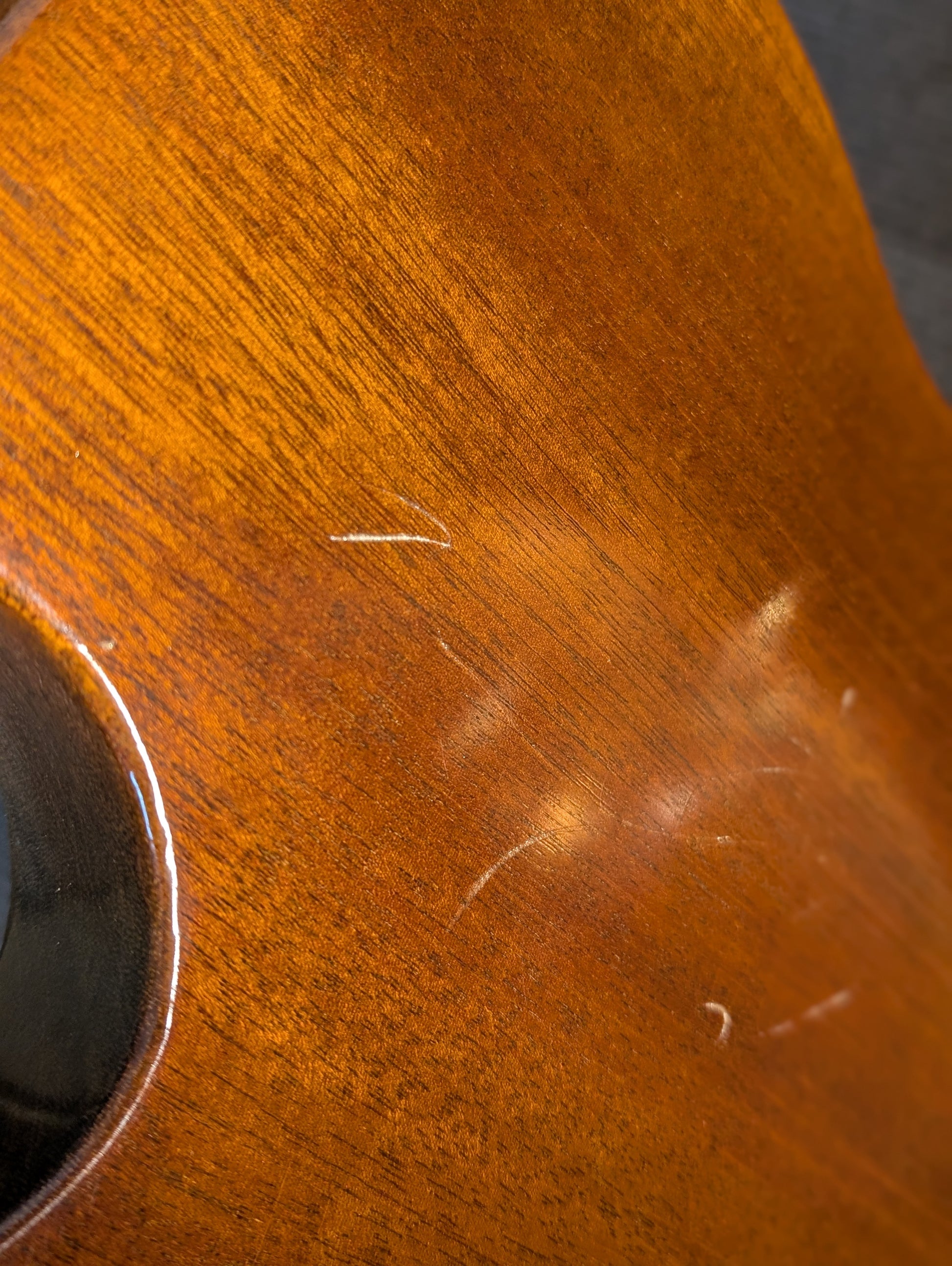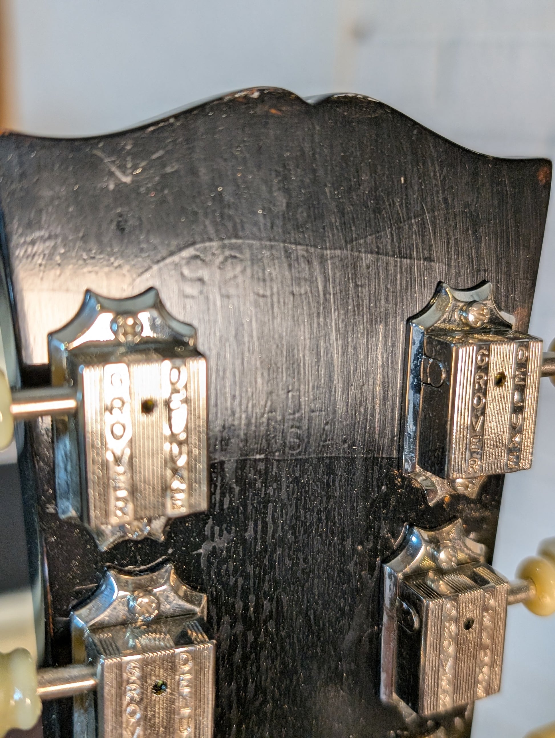 This guitar is in very good condition with some wear and what looks to be a repaired headstock break. Based on what we can make out on the serial we believe this to be a 1990 Les Paul Junior with either a very well done re-finish to the brown mahogany or potentially a special limited run. These models originally had a black pickguard, the pickguard on this specific guitar is cream and may or may not be original to the guitar. The pots, wiring and pickup look to all be original and working well with no issues. The back of the headstock has had a black stinger painted over most likely to cover a headstock repair or defect. The paint job was done very well and there is nothing feel wise at headstock and at the nut that affects the feel and playability of the guitar. The tuners look to also have been replaced with Grover Deluxe heads, originally this guitar had a Grover mini heads. A 1980's brown rectangular Gibson case is included with the guitar.