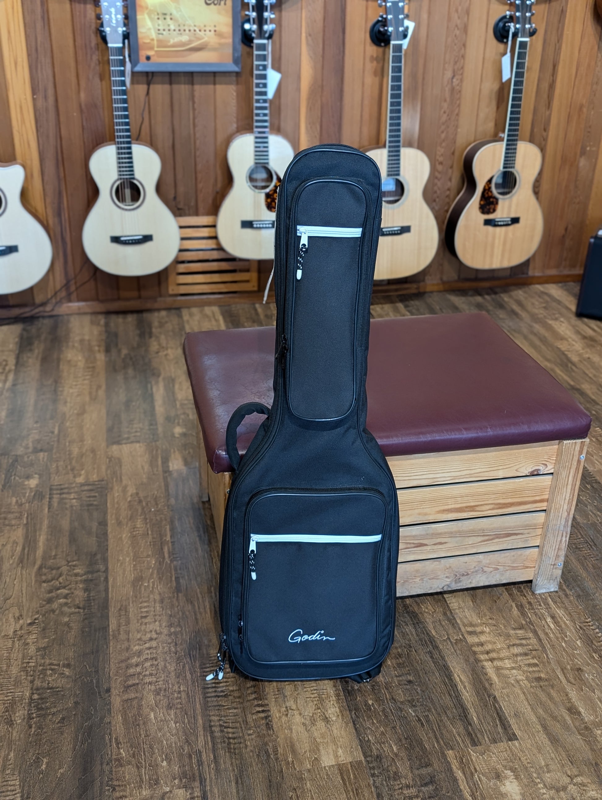 This guitar is in very good condition and was very well maintained by the original owner. There are no dings or damage to the guitar and the frets are still in nearly new condition. All electronics are working well with no issues and setup wise this guitar is playing great. A Godin gig bag is included.