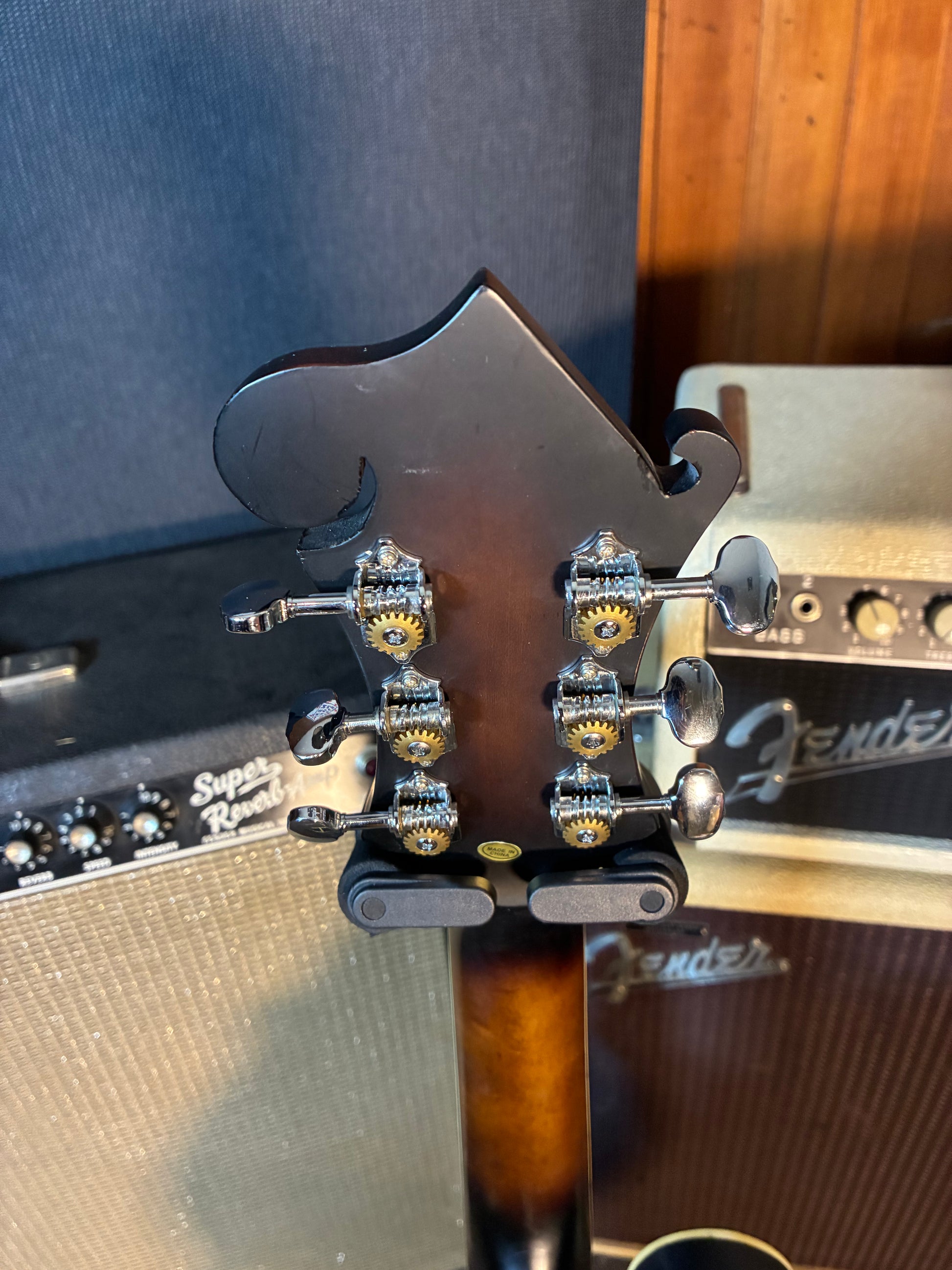 With standard E-E tuning this guitar just stayed in the dryer a bit too long. This guitar is built using a larger “Artist” or F-Style Mandola type body to increase the resonant air chamber providing more volume, better low-end response, and adds just the right amount of timber in its voicing. Compared to our previous manditar models, the newer F-6 and F-12 uses an extended 15” scale allowing for more hand room. Barre chords are even possible near the nut. The Zero Glide nut is very effective at maintaining tuning stability and allows for the lowest possible action alleviating the string tension which is common with short scale instruments. The fretboard is radiused for comfort and the ebony bridge contains a built-in pickup for easy plugged-in playing.