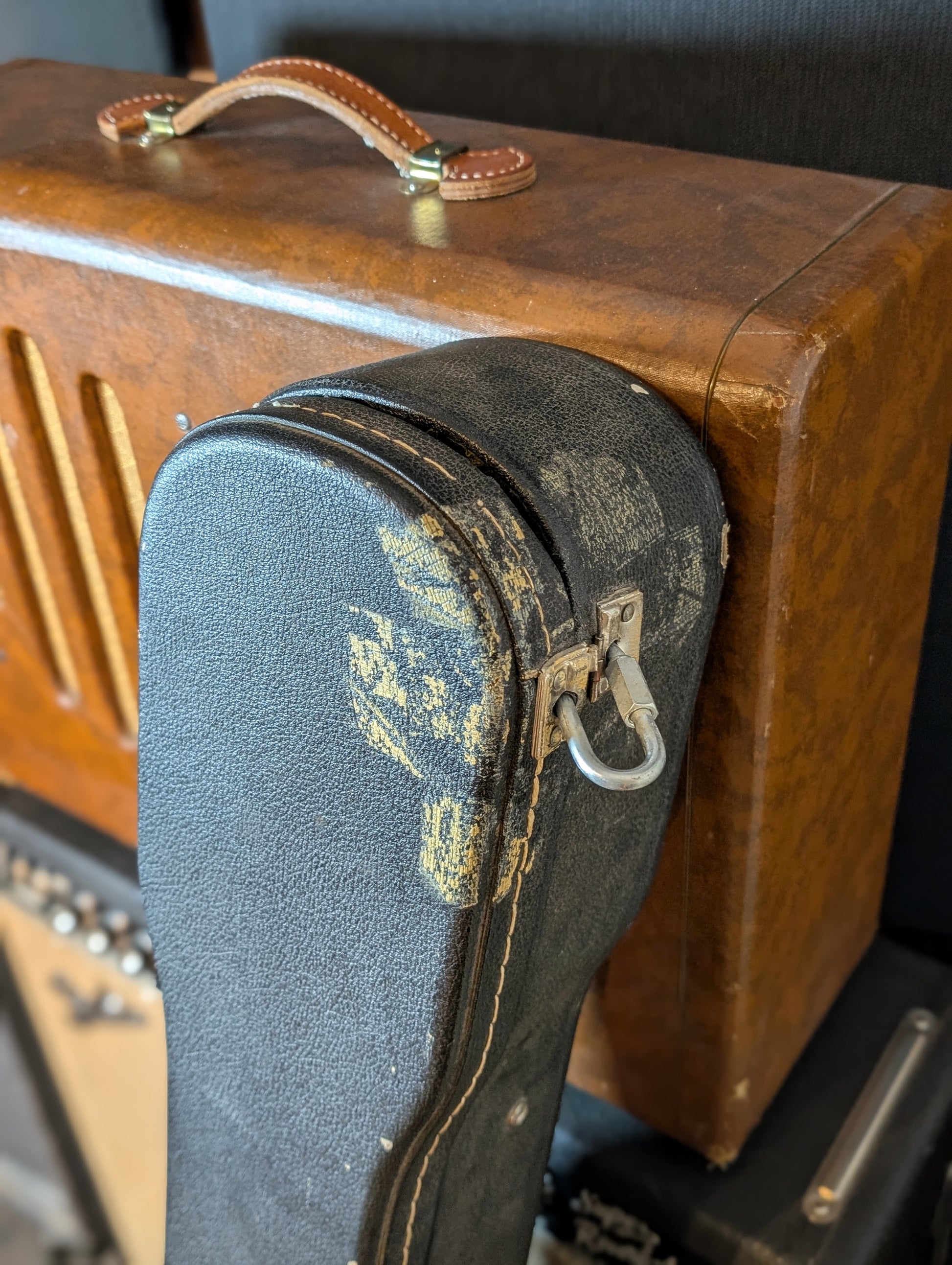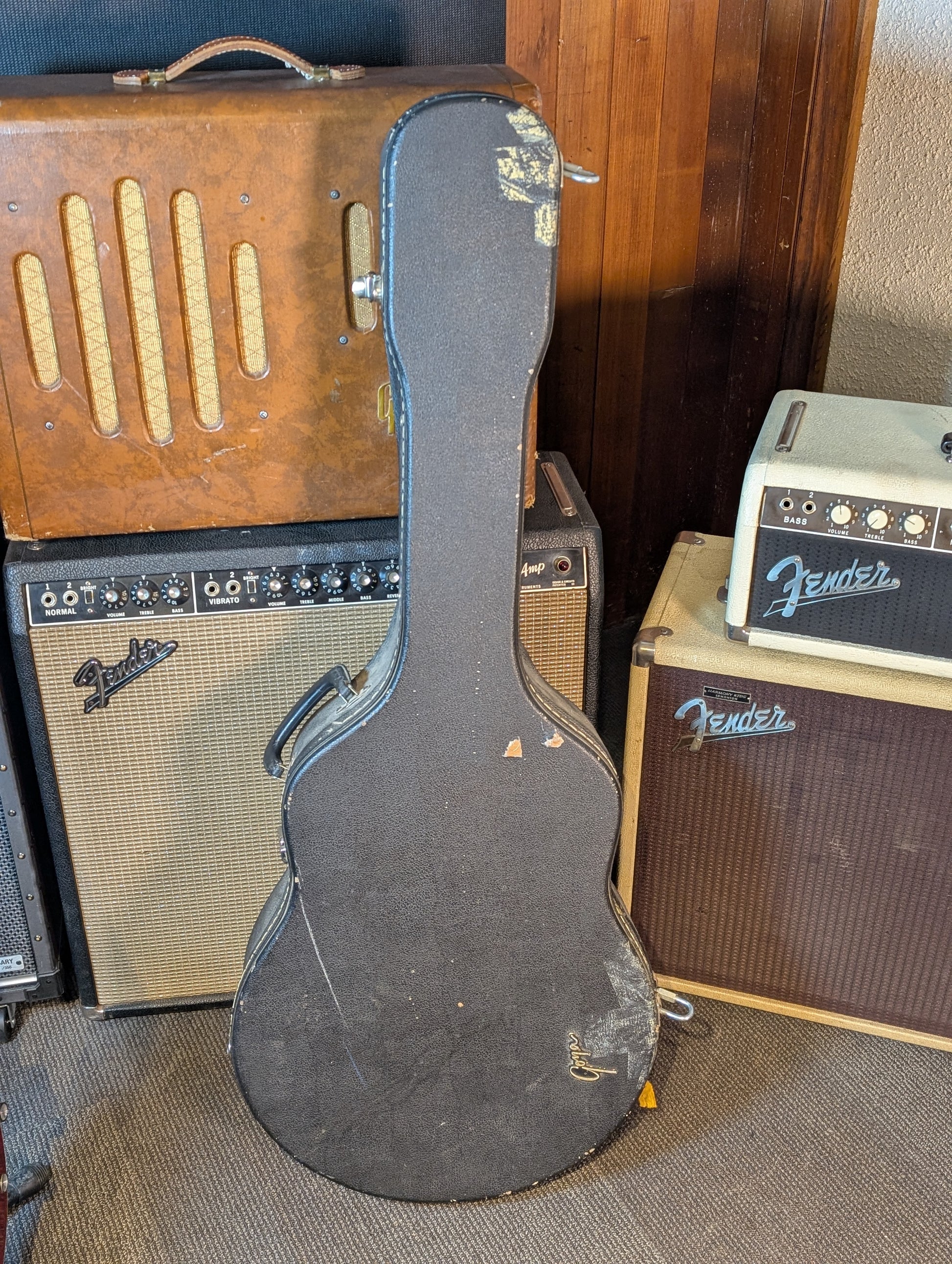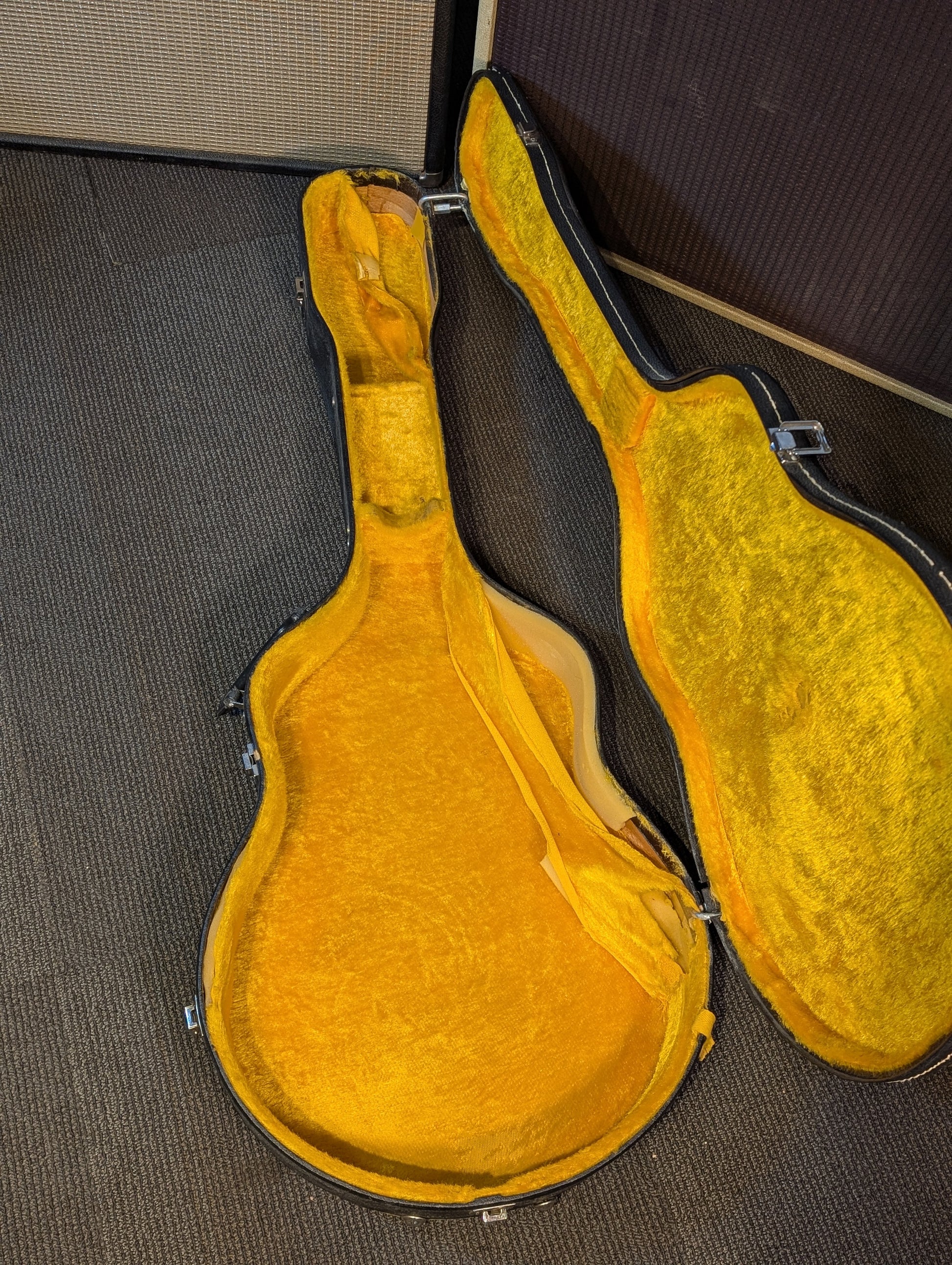 This guitar features a Maple body with a center block, Mahogany neck and Rosewood fingerboard. The pickups are stamped and are Alnico but it is unclear exactly what they are. They are a fairly low output and do a good job of mimicking original PAF pickups. Pots, switch and jack all look original and working well with no issues. The original case is also included but unfortunately in need of repair. It will be included in the purchase to complete the set but is currently not in useable condition.