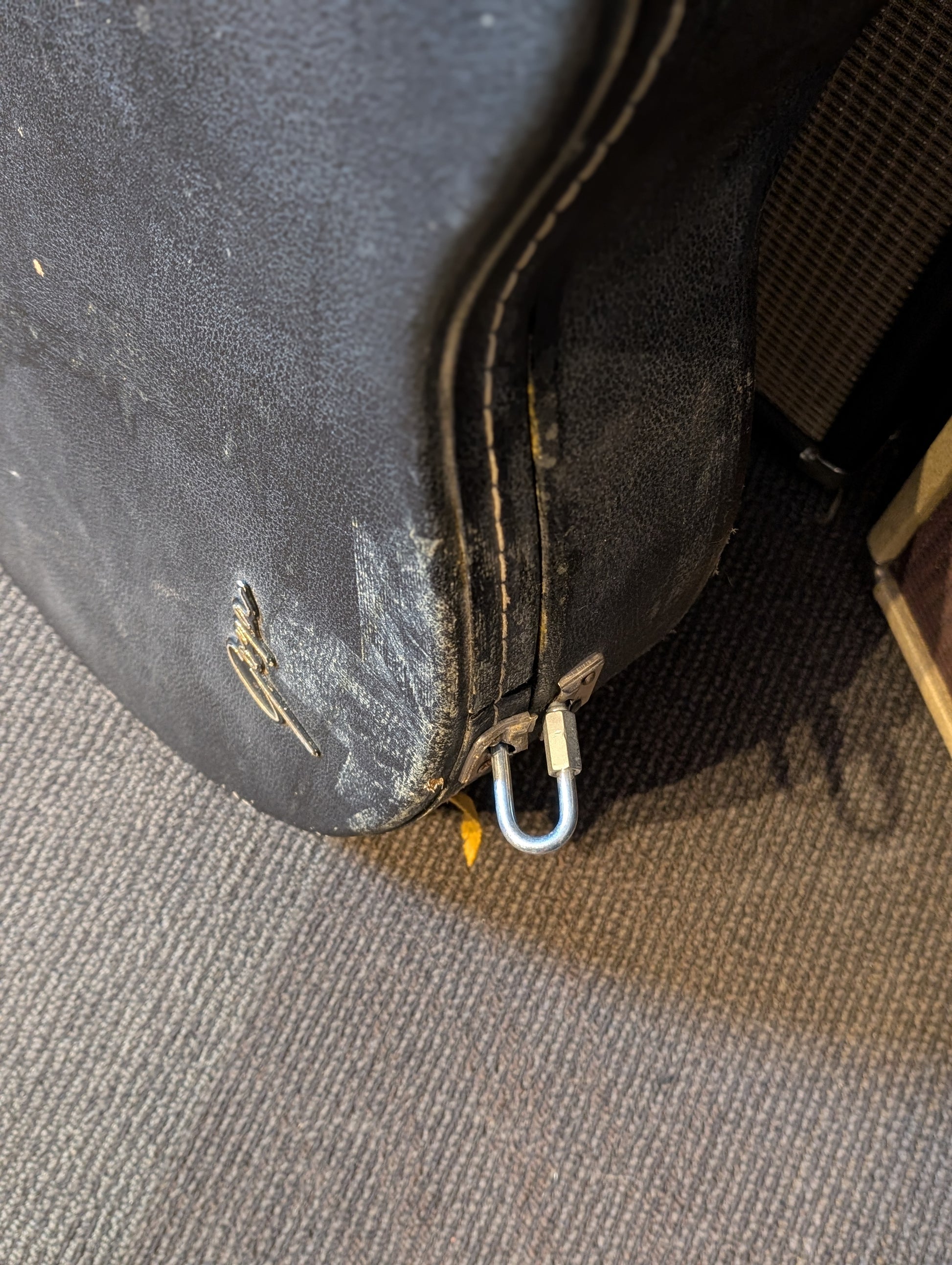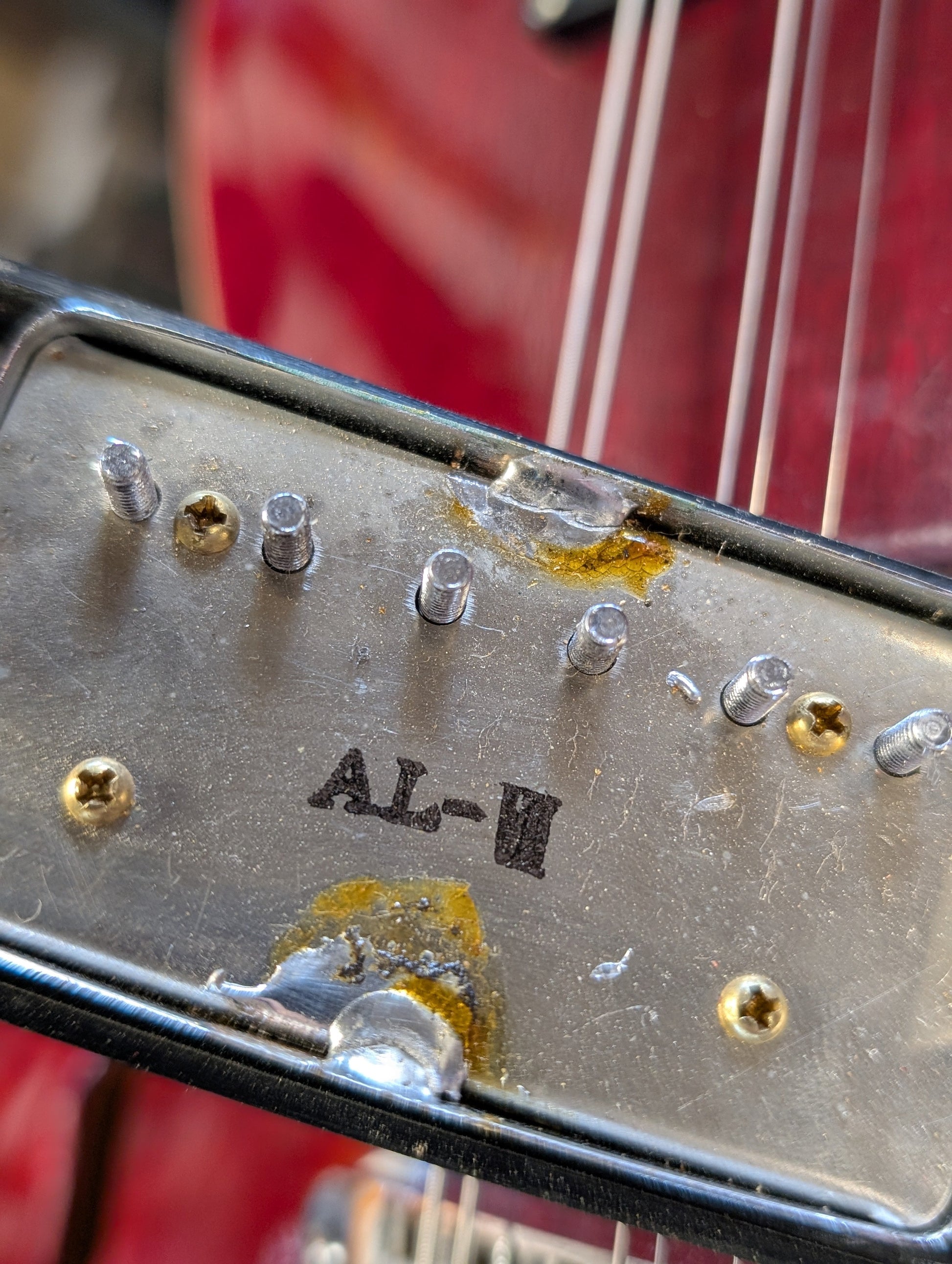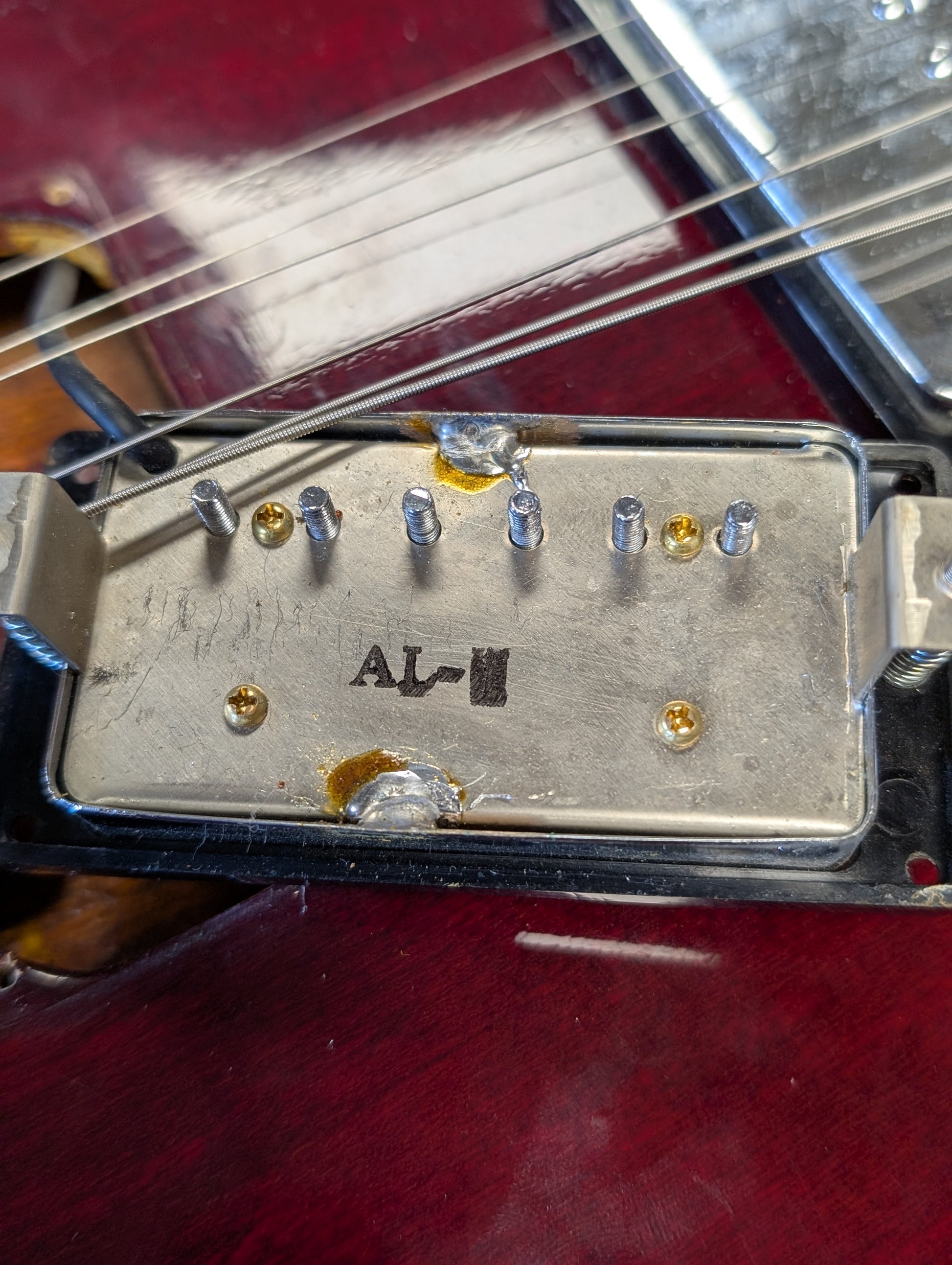 This guitar features a Maple body with a center block, Mahogany neck and Rosewood fingerboard. The pickups are stamped and are Alnico but it is unclear exactly what they are. They are a fairly low output and do a good job of mimicking original PAF pickups. Pots, switch and jack all look original and working well with no issues. The original case is also included but unfortunately in need of repair. It will be included in the purchase to complete the set but is currently not in useable condition.