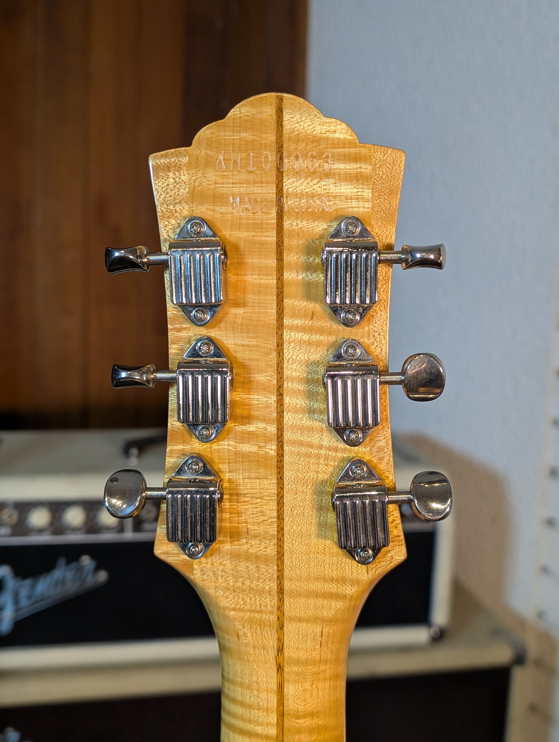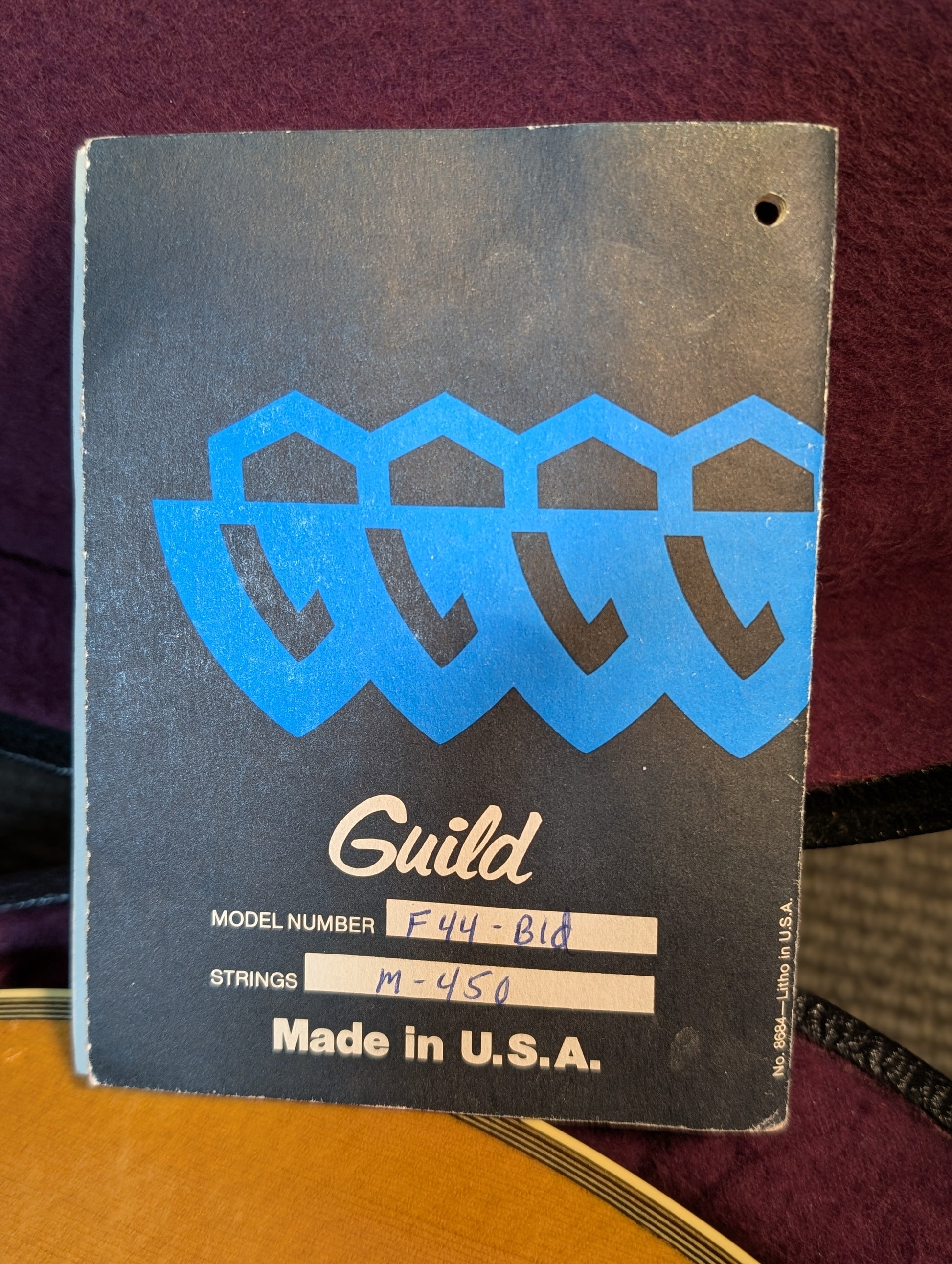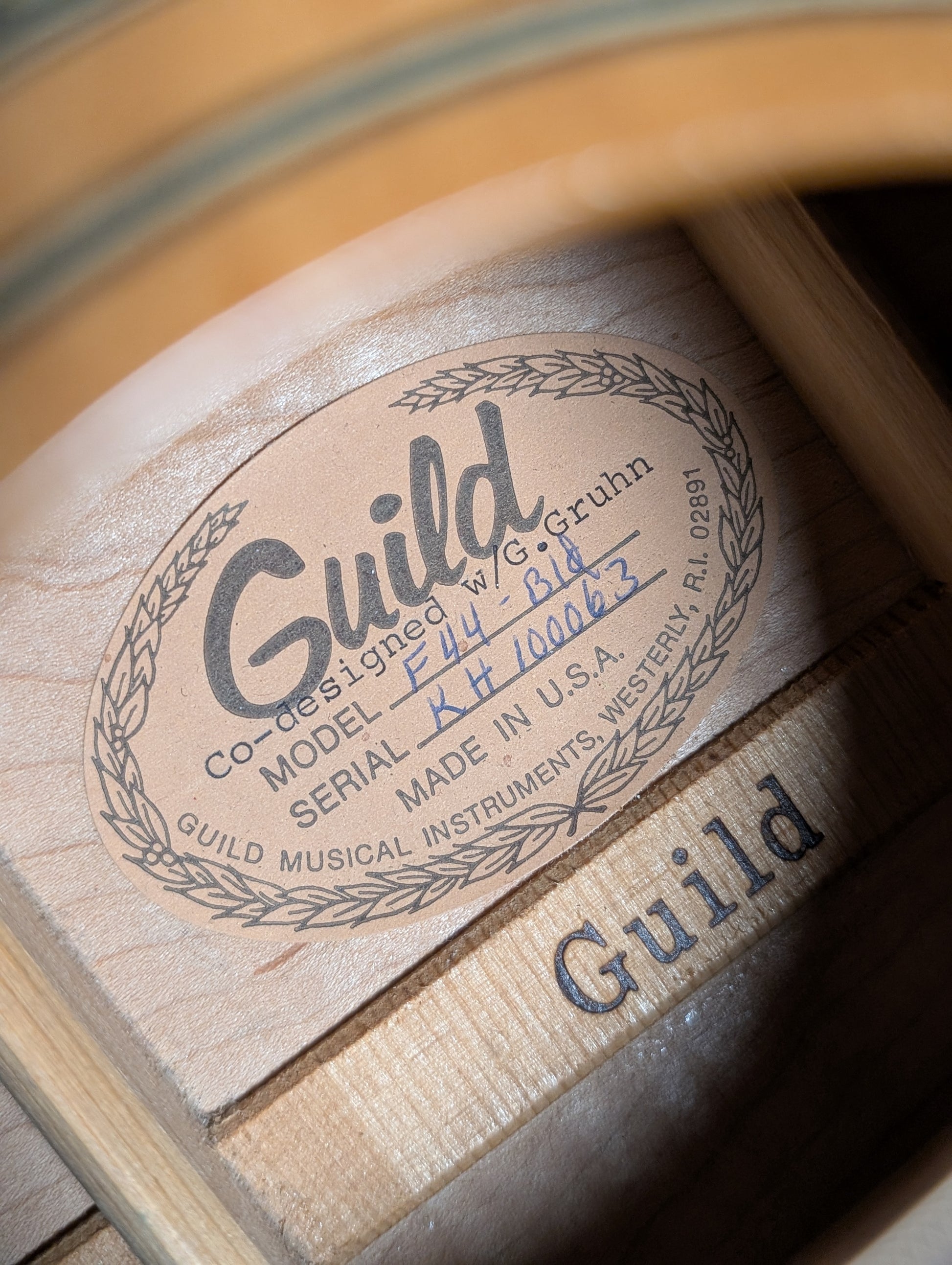 The F-44 model was originally offered from 1984 to 1986 and were co-designed by the legendary George Gruhn during his time working for Guild (1984-1988). The model was later renamed the GF-60M in 1987. These guitars were built in Guild's Westerly factory and featured solid Spruce tops, solid flamed Maple back & sides, Maple neck with a Mahogany stripe and an Ebony fretboard and bridge. This guitar also has some beautiful diamond shaped pearl fretboard inlays, inlaid headstock logo, bound body & neck and over time the natural color has aged into a great vintage amber color.