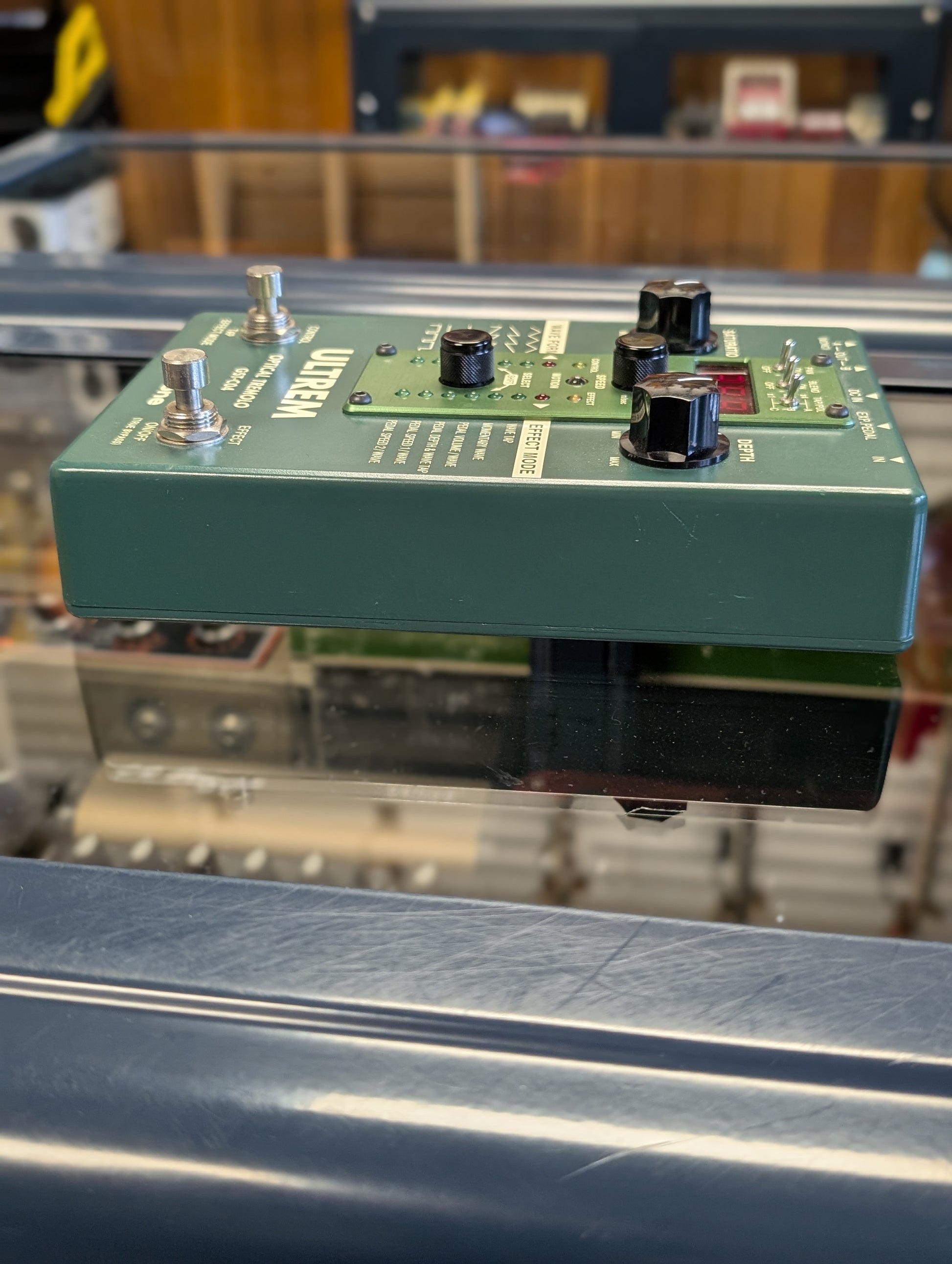 The Ultrem’s CPU also offers six selectable waveforms when the unit is used in the oscillator-controlled Effect Modes - a variety of Triangle, Sawtooth, and Square Waves are available for quick selection via the unit’s front panel, allowing the Ultrem to mimic any Tremolo type from the smooth, rolling tone of vintage amps to the tight “helicopter” chop so popular in today’s music. In addition, the oscillator’s rate can be displayed in BPM or Milliseconds allowing for precise syncing to song tempo or external devices.