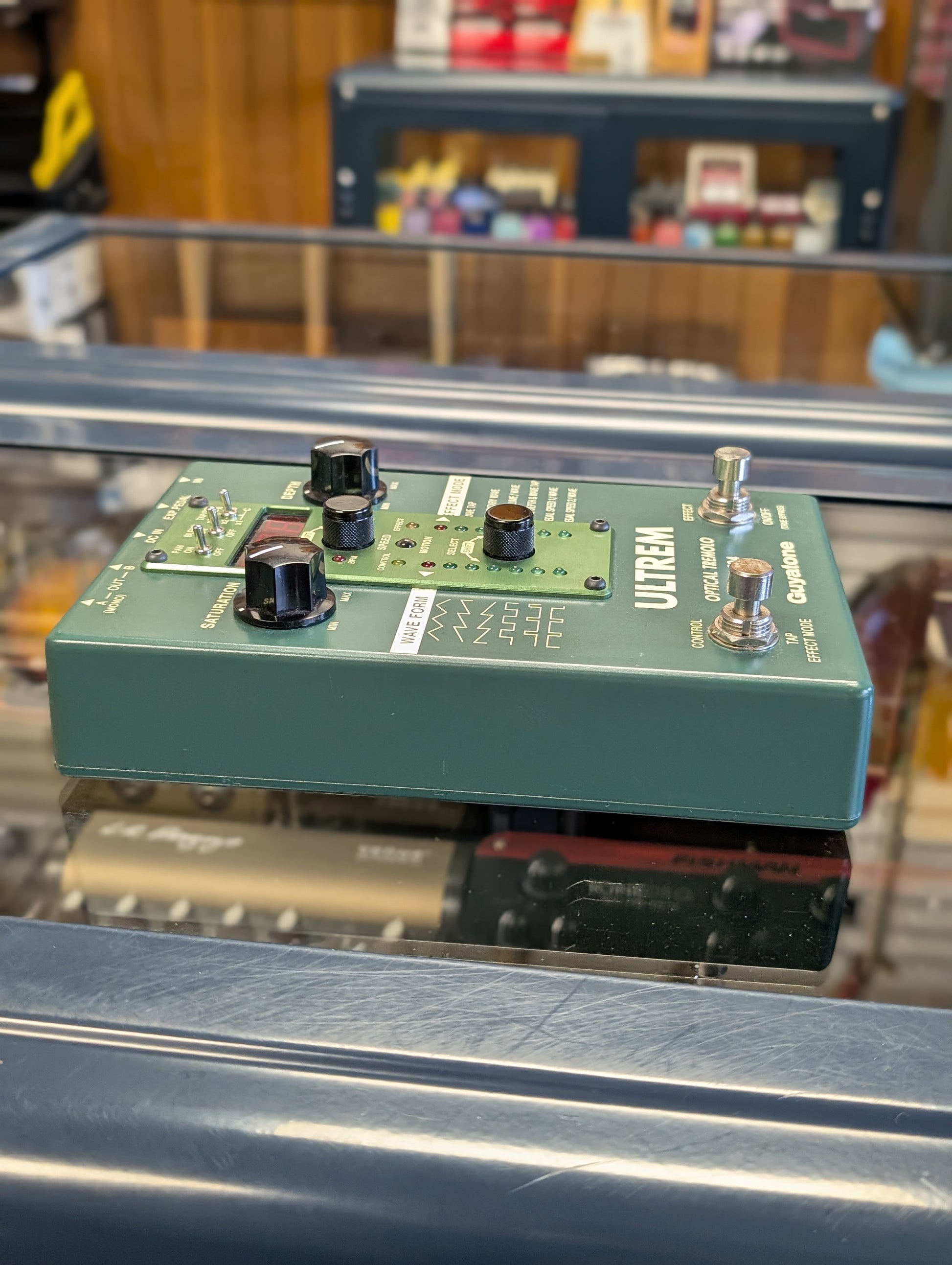 At the heart of the Ultrem is Guyatone’s proprietary CPU controller which allows for quick selection of the Ultrem’s primary effect function. Six Effect Modes are easily accessible from the unit’s front panel, and each Effect Mode features a Sub-Mode that can be accessed with a quick press of the Control Footswitch. If that wasn’t enough, the last two Modes also feature Bonus Modes that allow for manual selection of the oscillator Waveform via an external expression pedal.