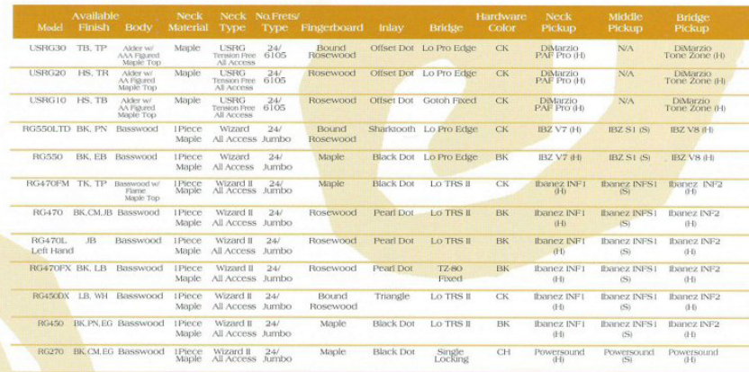 For players desiring even more, the deluxe RG550LTD features V7 and V8 pickups, sharktooth inlays, a matching mirror pickguard and Cosmo Black hardware. Both the RG550 and RG550LTD are fitted with the Lo-Pro Edge tremolo, acclaimed by many as the best sounding, smoothest action double-locking tremolo system"