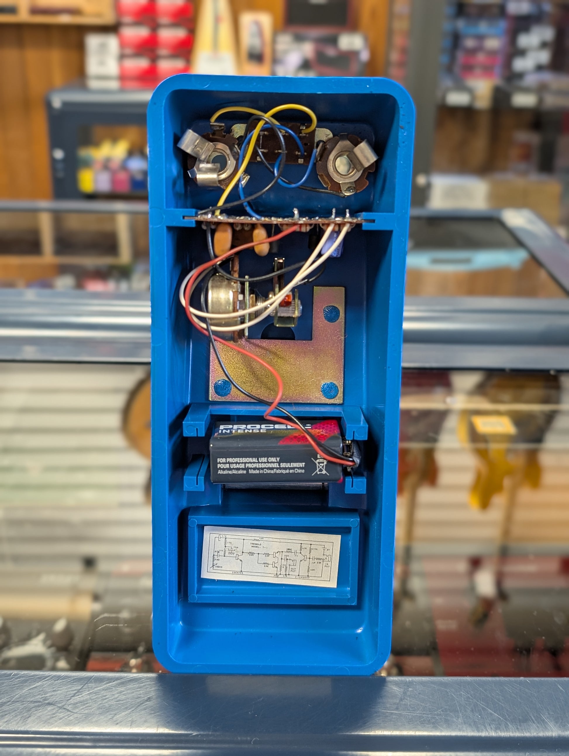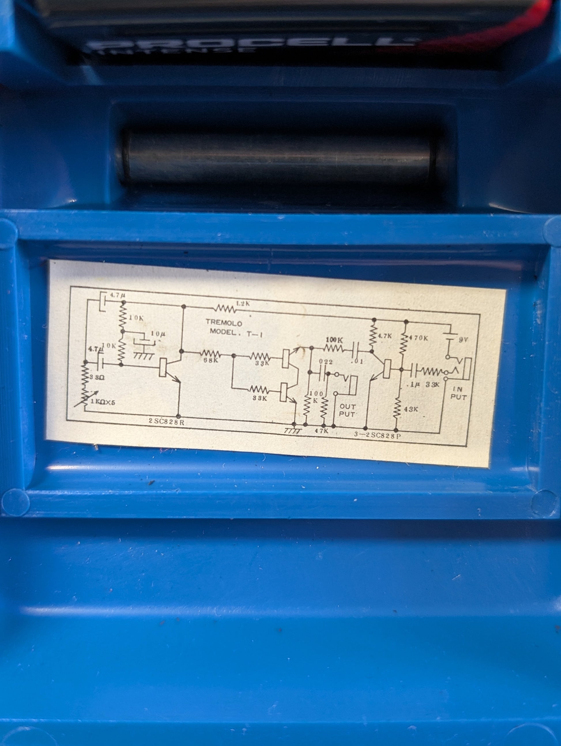 This pedal was made sometime in the 1960's in Japan. The circuit itself is a very choppy and more on the square wave side of things sound wise making for very percussive effect, the treadle on the pedal controls the speed of the effect with a preset depth. There is an on/off toggle switch on top to turn the effect on & off.