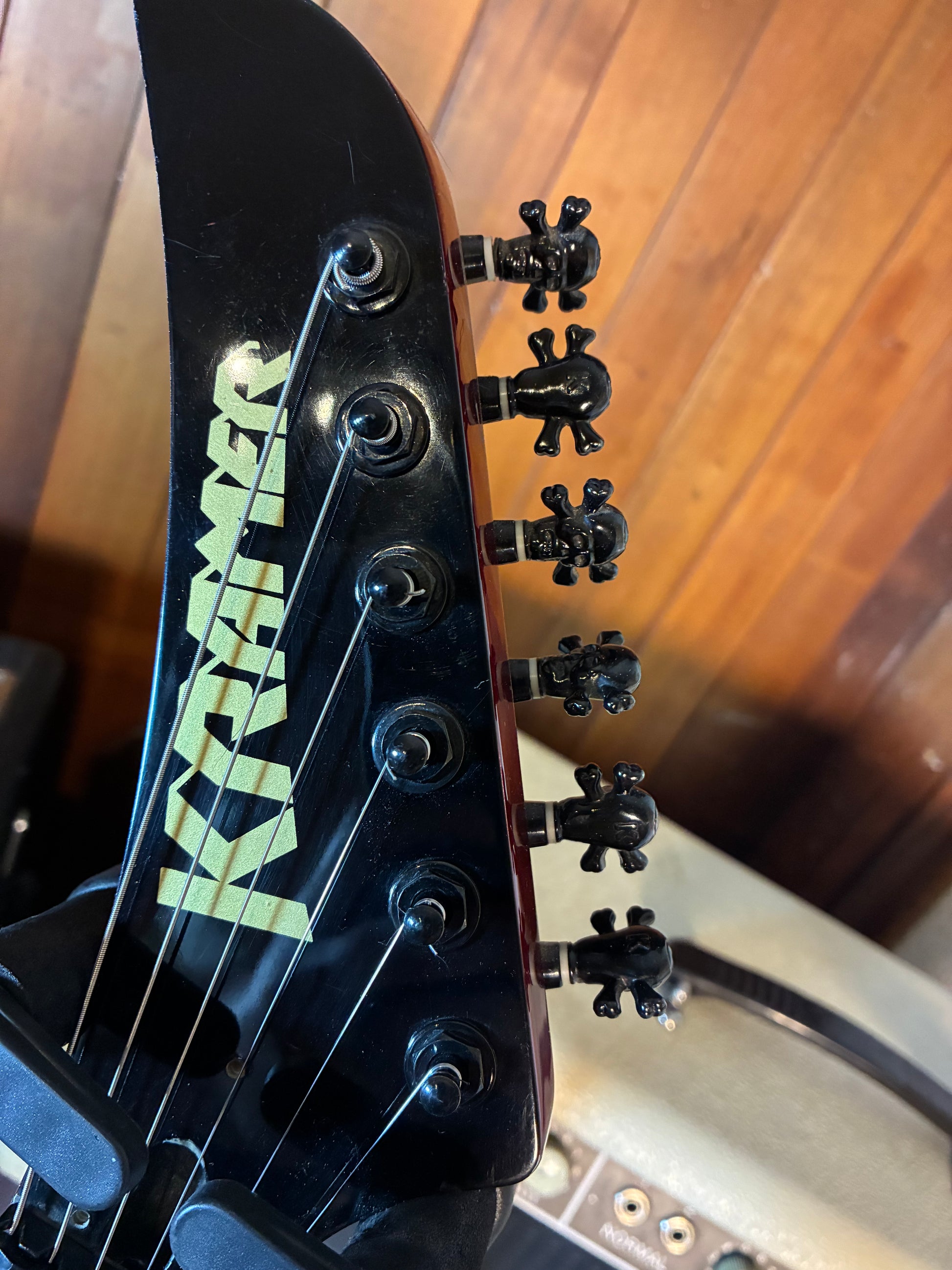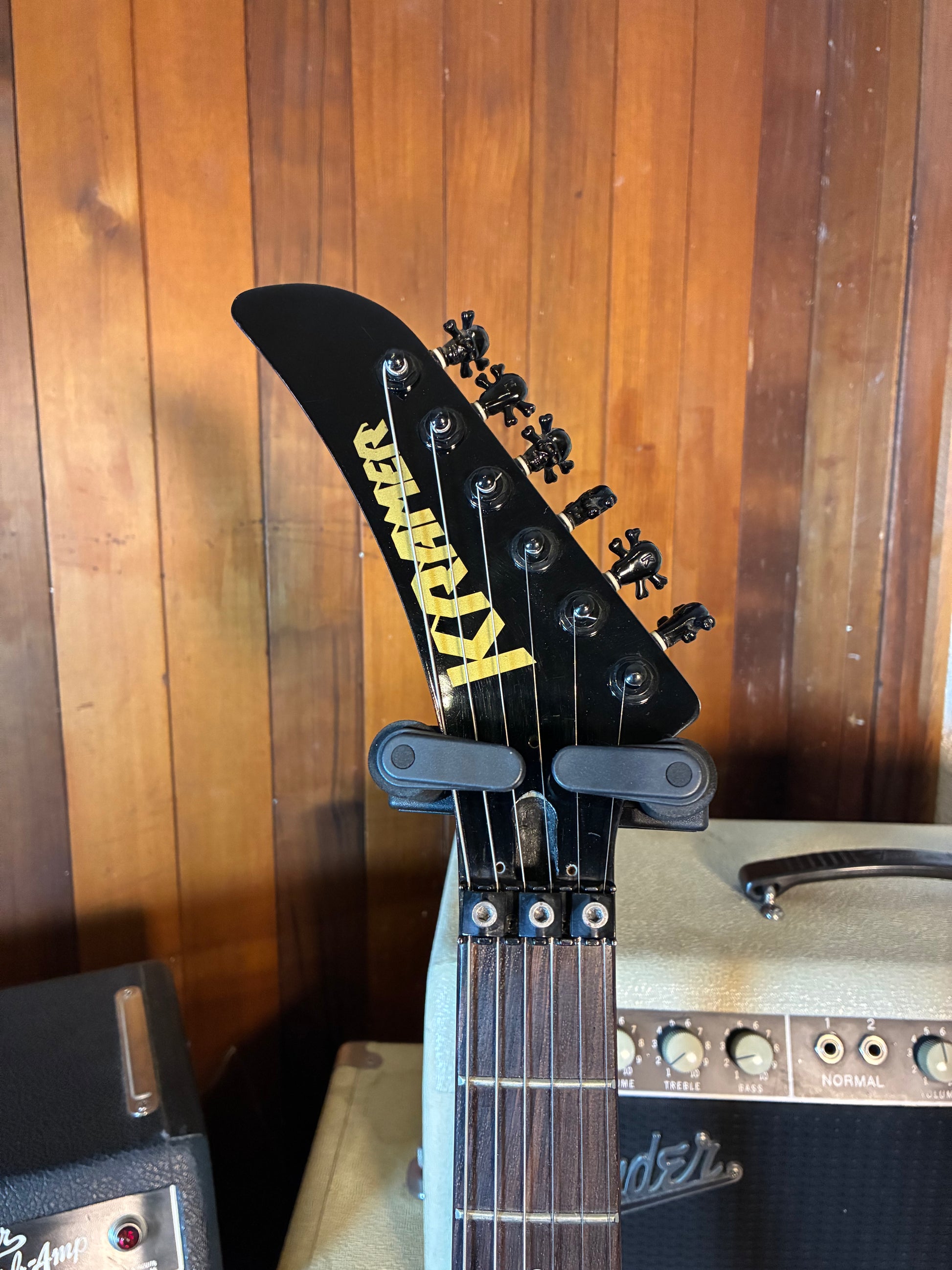 This guitar is in good used condition with some cosmetic wear, most notably the serial number which has been removed on the back of the headstock. Based on our reasearch we believe this to be a late 1990's Korea made Kramer guitar. All parts seem to be original aside from the tuner buttons which have been replaced with black skull & crossbones. All the electronics have been tested and are in 100% good working condition. This guitar does not come with a case or gig bag, it is also missing the arm for the bridge.