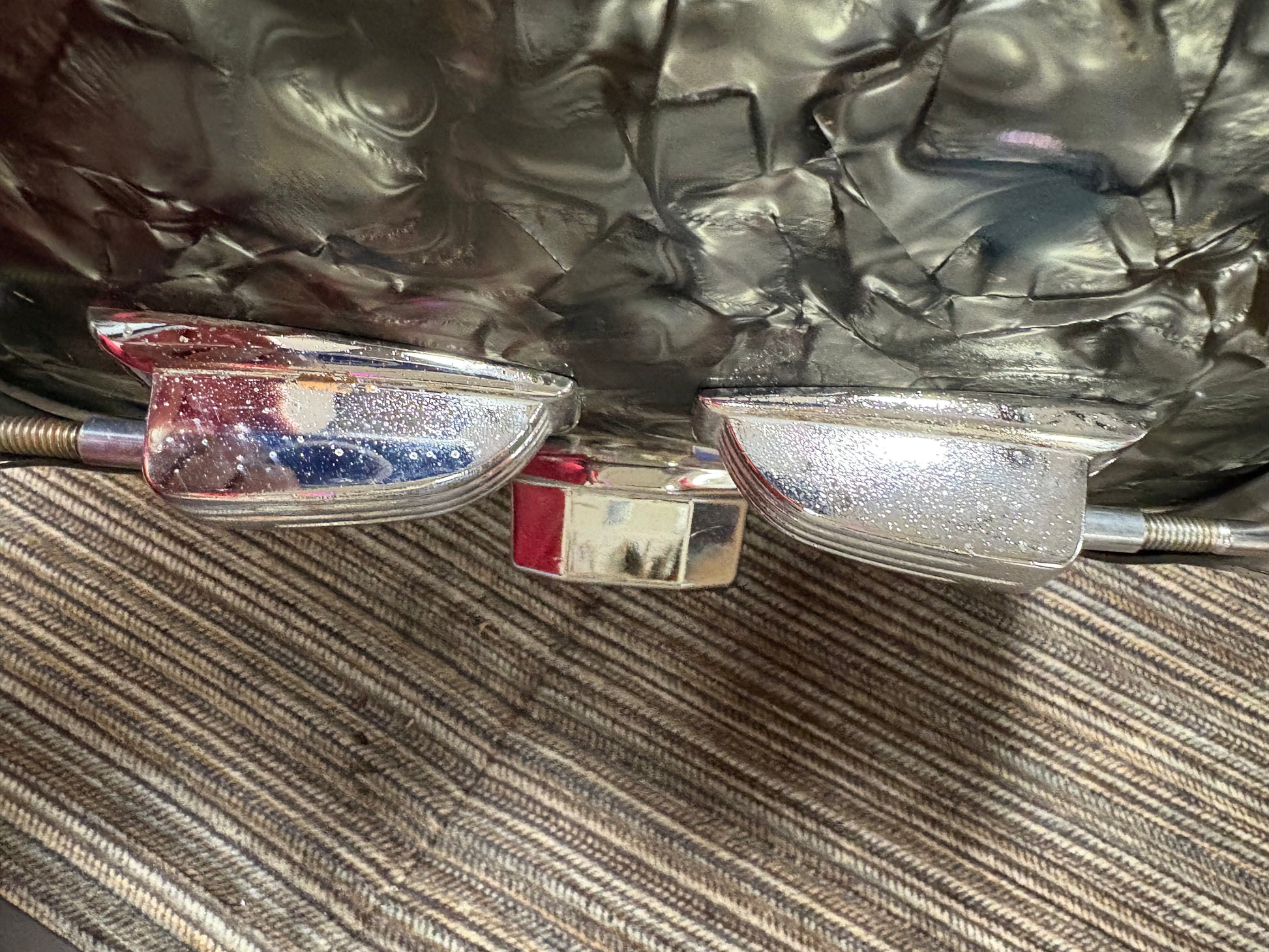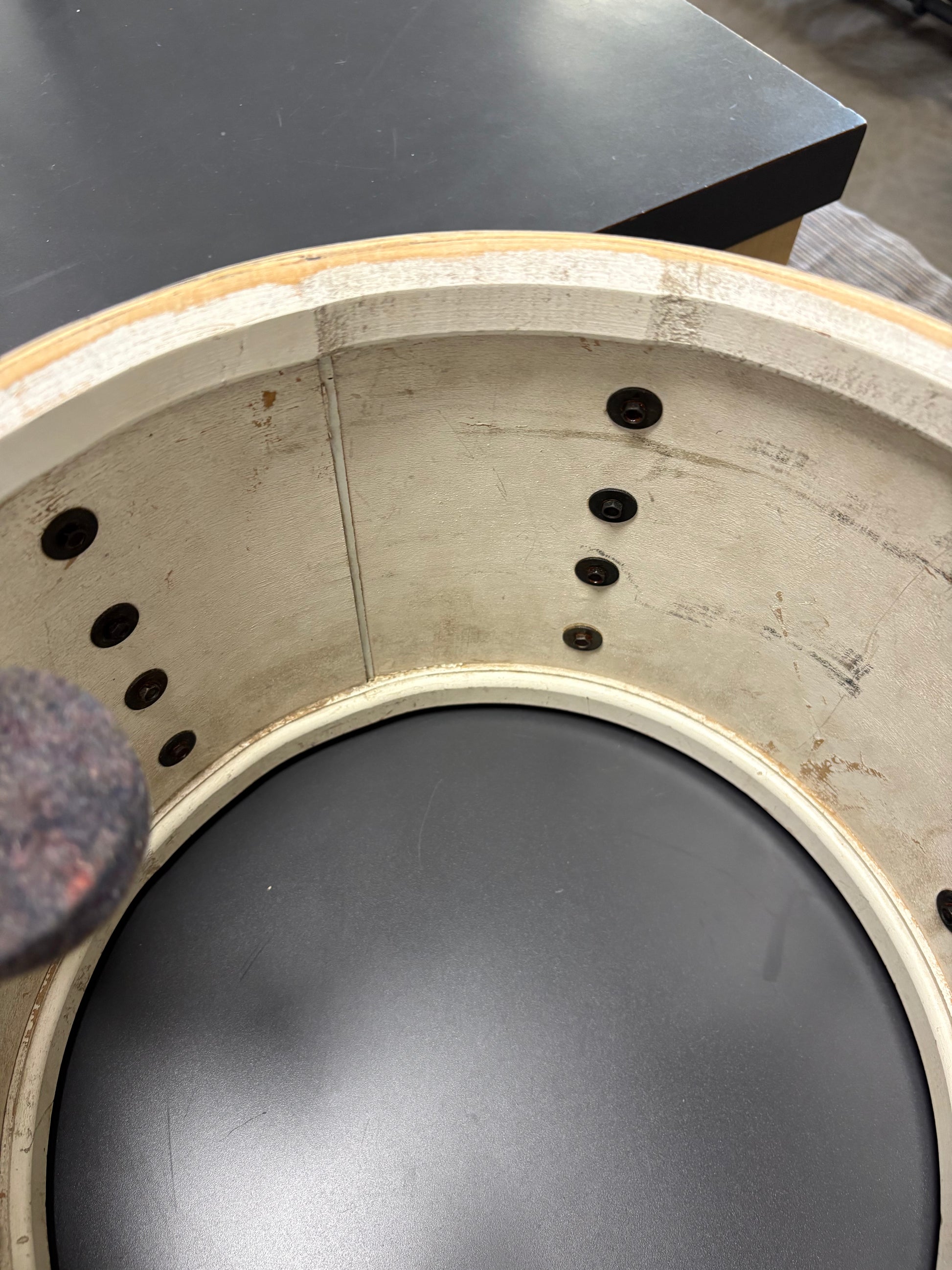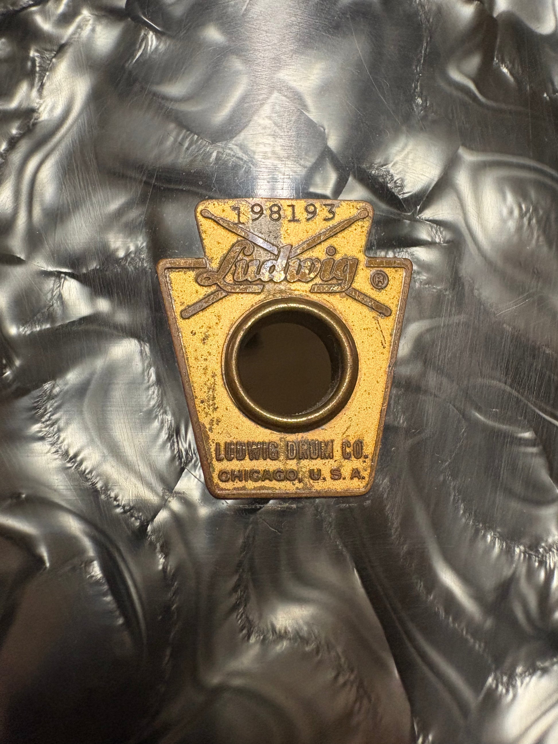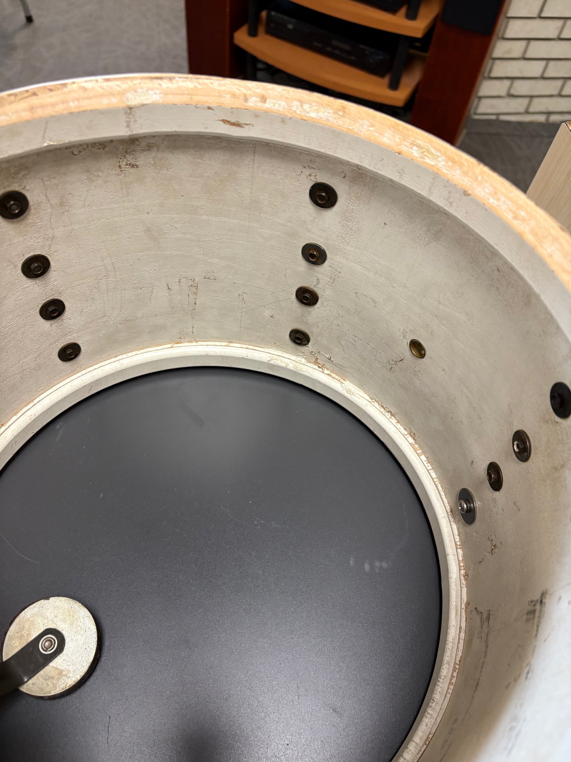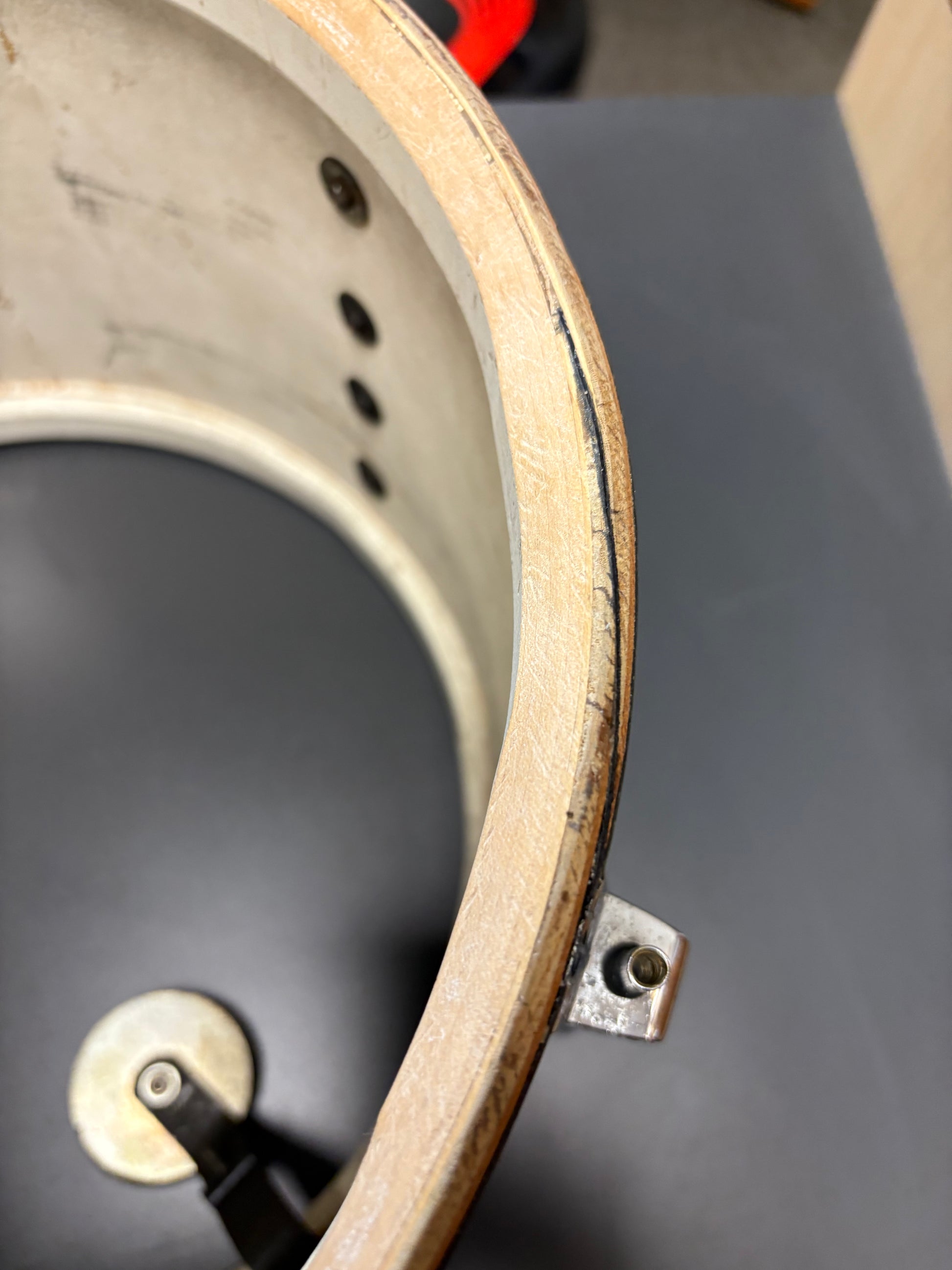 This tom , stamped September 1965, is in good condition. There was ply separation that has been repaired with epoxy. The bearing edges are somewhat worn but in overall good condition for this 60 year old drum. There are 6-2 3/8 and 6-1 7/8 key rods and all threads are sound. The lugs are showing some minor pitting but the hoops and tom mount are good. The internal muffler is working 100% as well. Reso head is a generic clear and the batter is Remo Coated Ambassador.