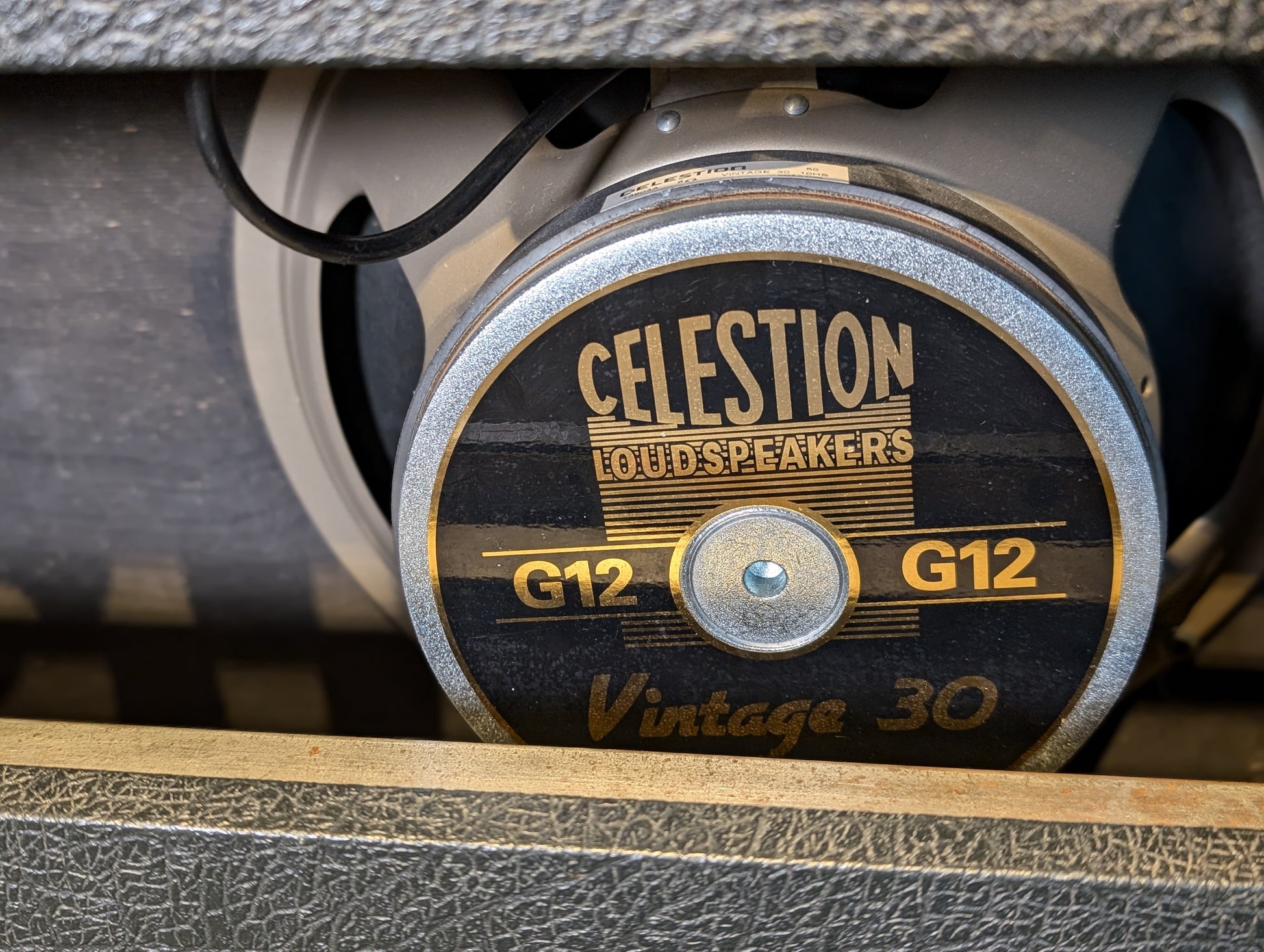 This amp is in good condition with only some minor cosmetic wear. It has been fully serviced in the last few years and not played very much. As part of the service the tubes have been replaced with 2 Silvania EL34, 3 Mullard 12AX&, 1 EXH 12AX7 and 1 Groovetube 12AX7. The original speaker has been replaced with a Celestion Vintage 30 and sounds great. The amp has a new footswitch as well that changes from the normal to the boost channel as well as switching the reverb on/off. A custom amp cover is included.