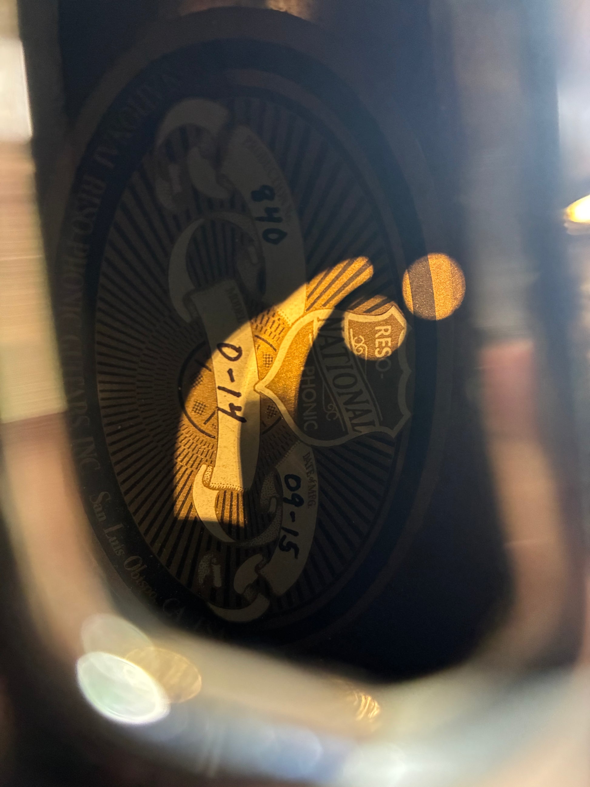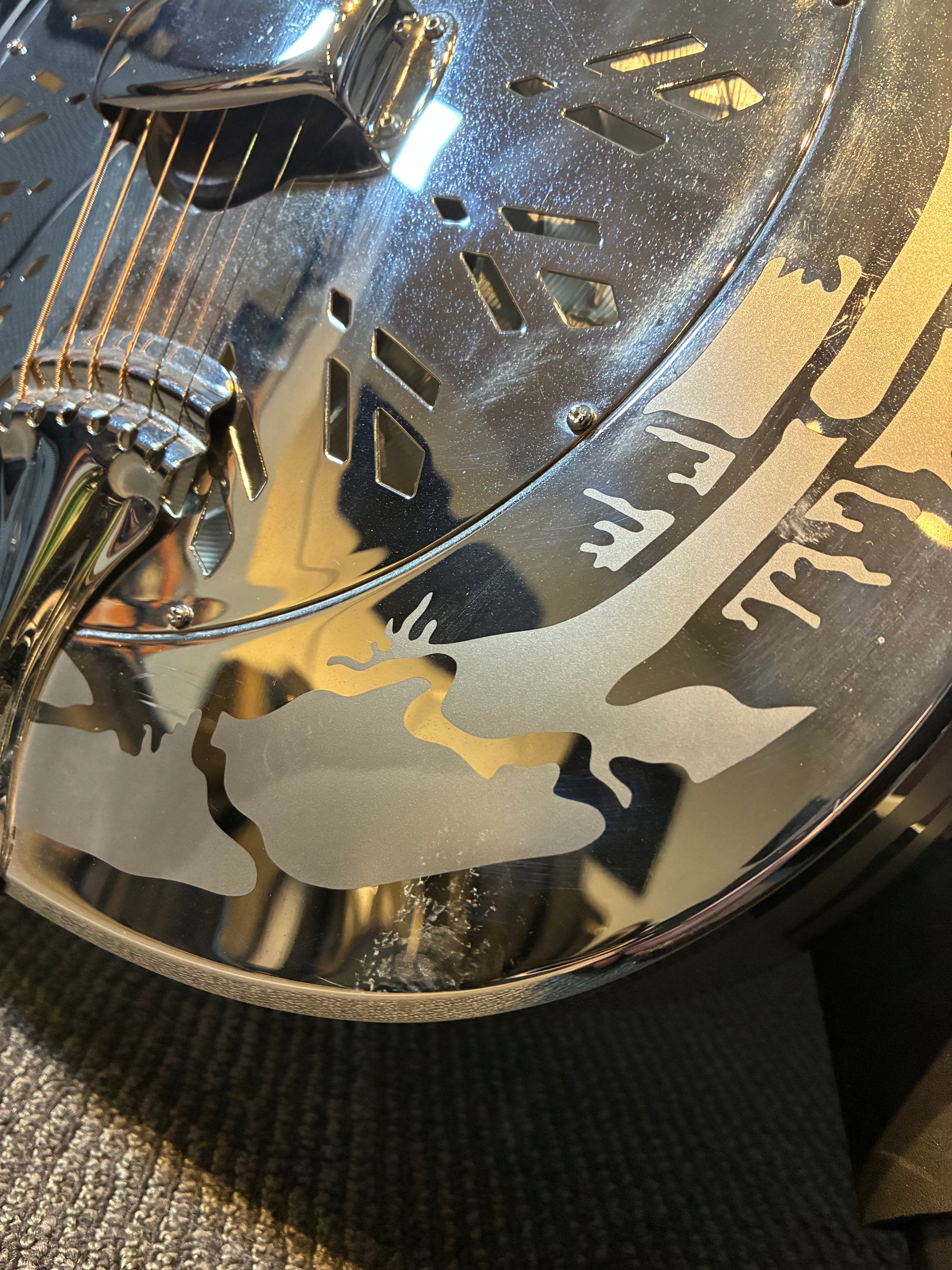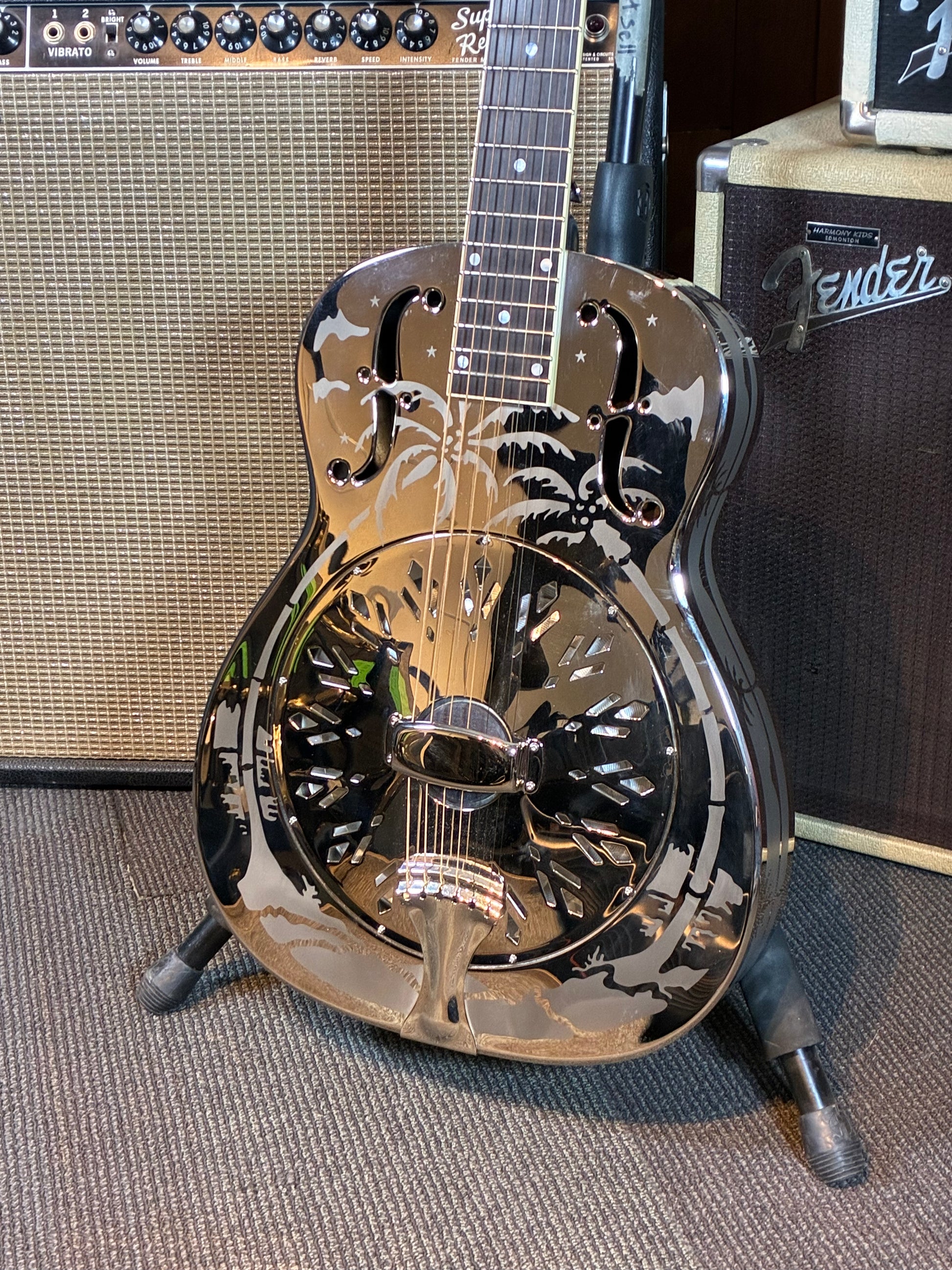 "National’s 14-Fret Style “O” became an icon when Mark Knopfler began using a late 1930s model and pictured it prominently on the cover of Dire Straits’ Brothers in Arms album released in 1985. Our reproduction is true to the vintage original. The smaller, 14-fret body allows versatility and ease of access for reaching those higher notes. The brass-bodied instrument is polished to a mirror-like shine, nickel plated, and then etched with the exotic Hawaiian palm-tree scenes. The maple neck is finished in a traditional sunburst. An ivoroid-bound ebony fretboard and vintage-style engraved tuners complete the look of this enduring classic."