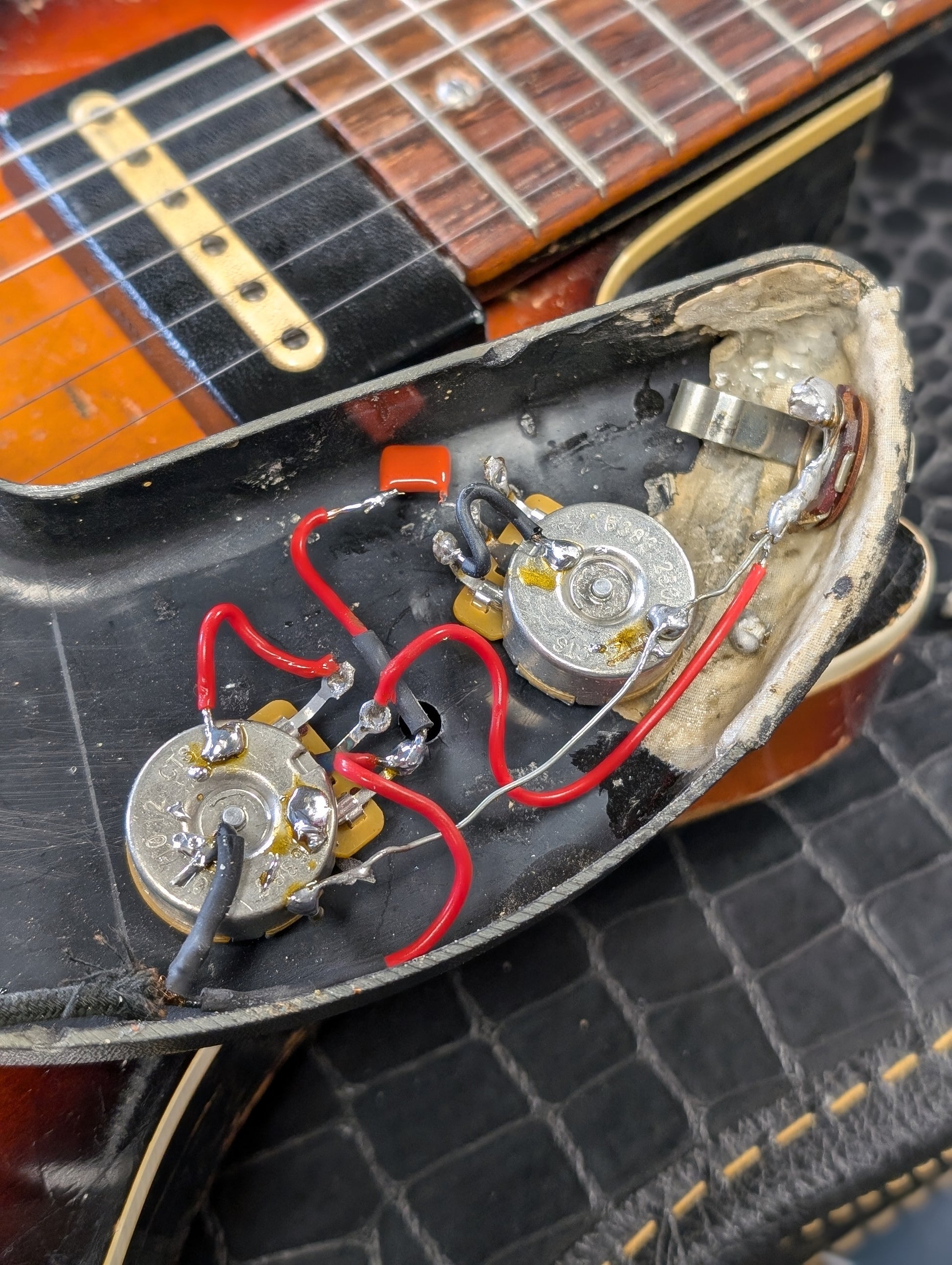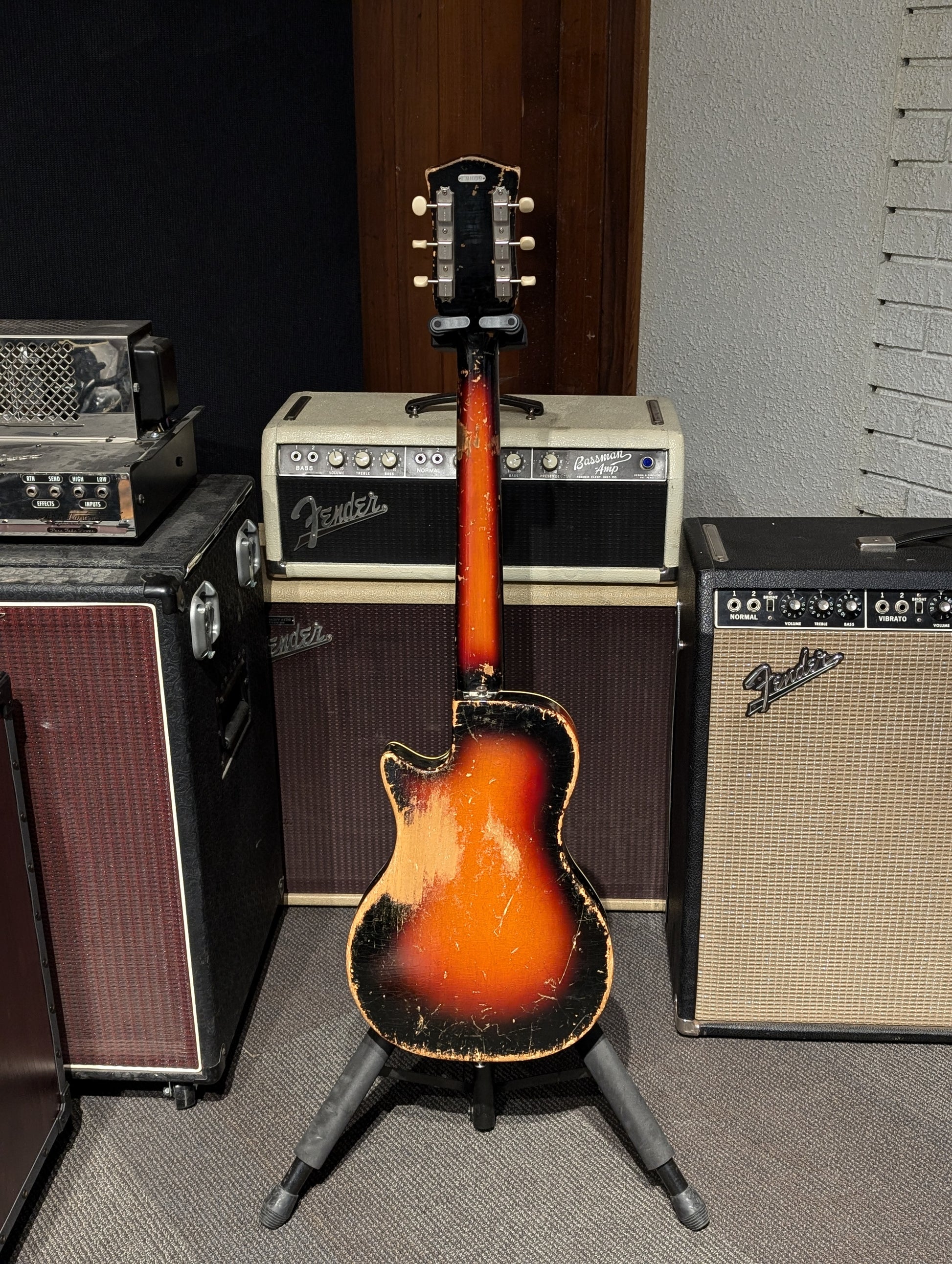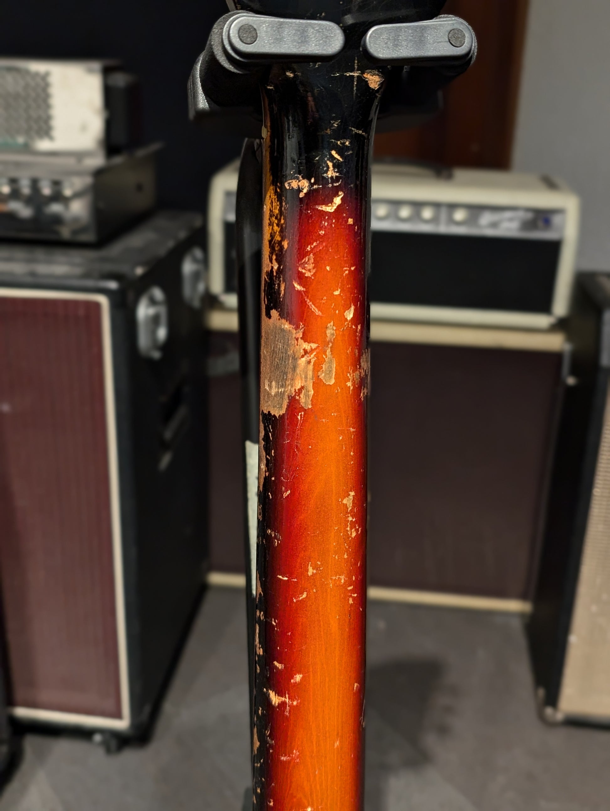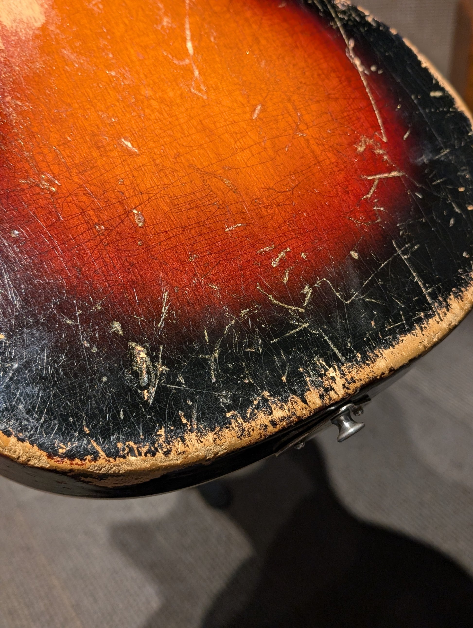This guitar is in good condition with some noticeable wear. The tuners have been replaced with vintage style heads and new CTS pots have been put in. This guitar shows its age with lots of dings and wear on body and neck but this is purely cosmetic and does not impede the playability of the guitar. The frets have some visible wear but again the instrument still plays well across the fretboard. The electronics are all original and working well with no issues. A slightly oversized vintage case is included with the guitar.