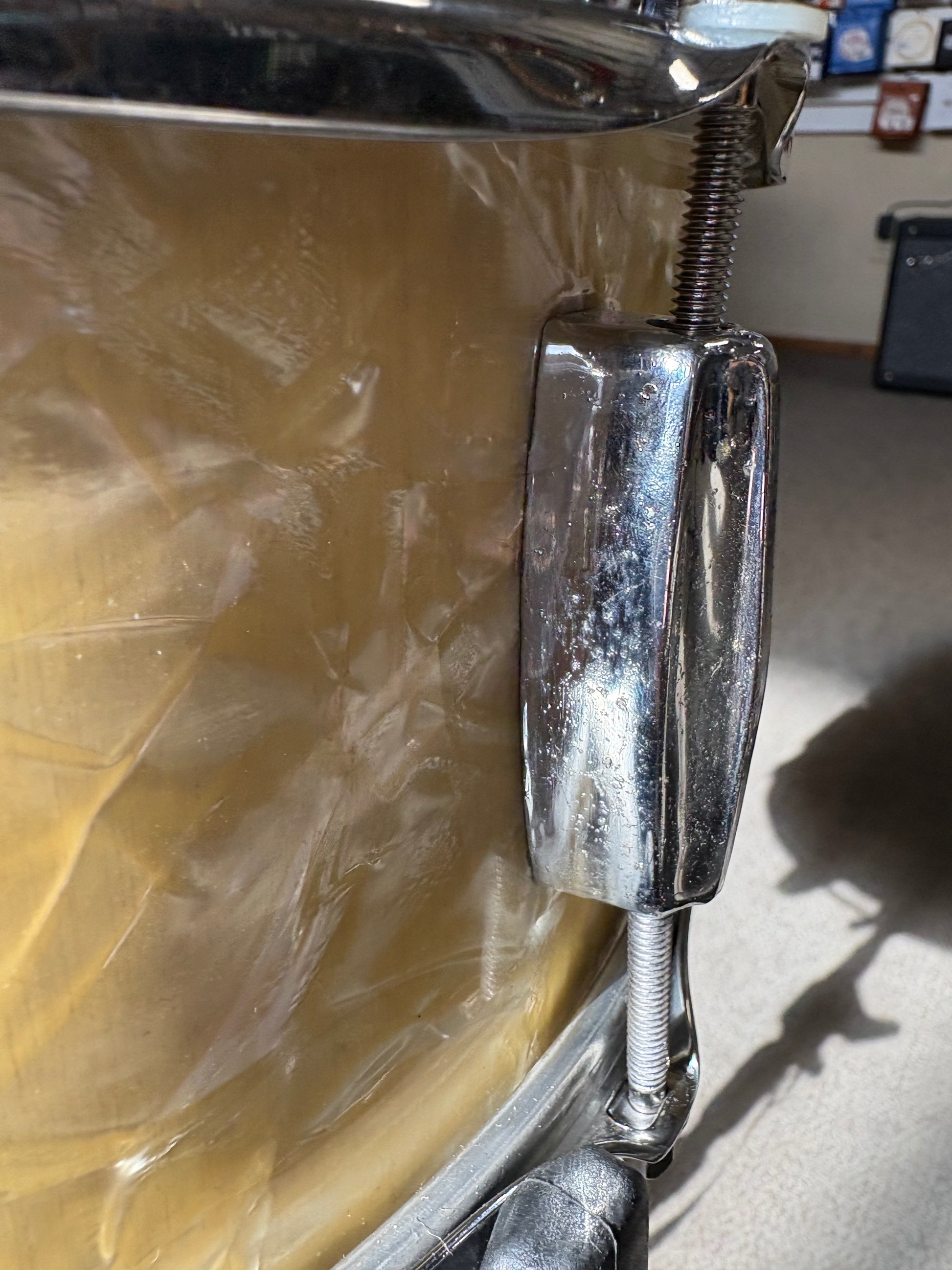 This snare drum is in fair condition with noticeable wear. The shell appears to be Luan or Philippine Mahogany as used in many of the drum sets of the period in Japan. The snare throw has been changed but is functioning with no issues. There is some slight shell separation in the bottom bearing edge but it doesn't appear to be moving. The original White Marine Pearl finish is still intact.