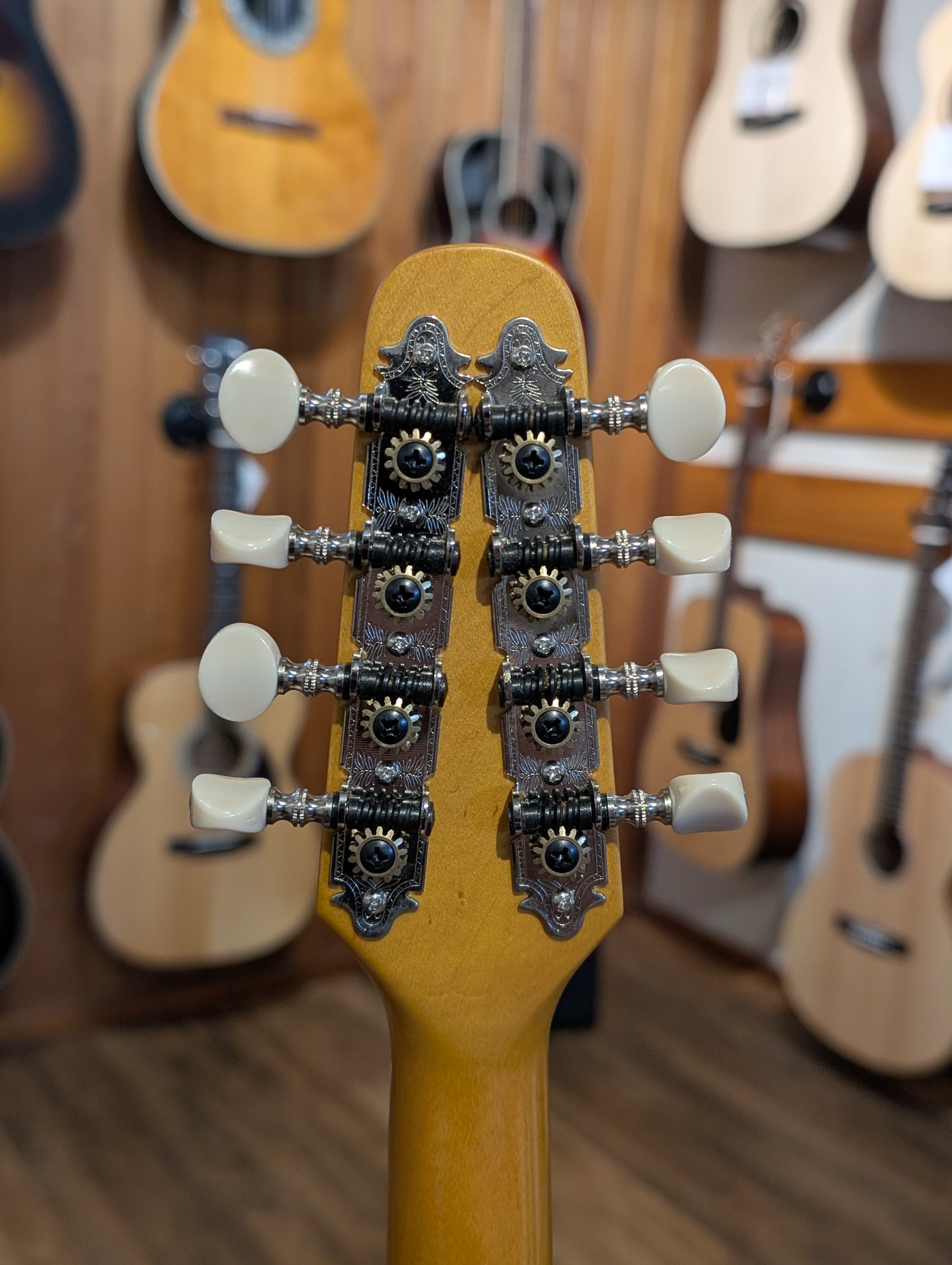 This mandolin is in very good condition with minor wear and no damage or major dings. All hardware is working well and the frets are in nearly new condition. A basic hardshell case is included, the case is slightly too big for the mandolin but still works well enough.