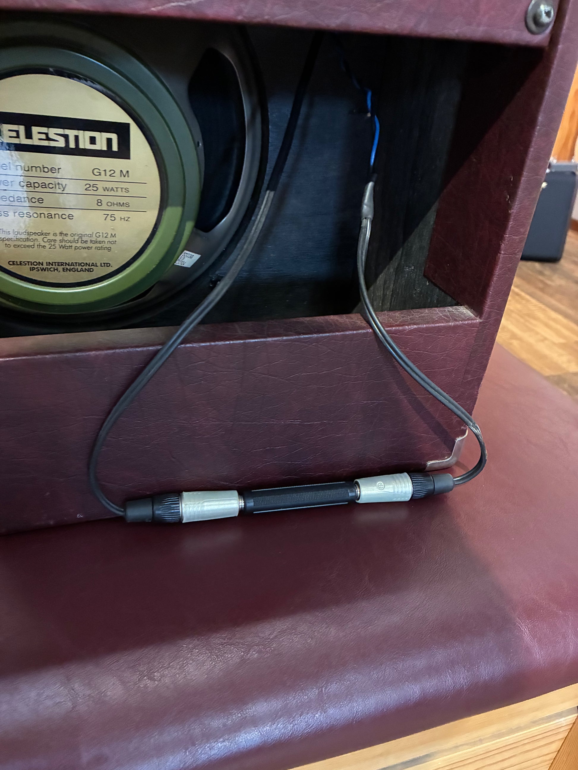 The speaker wiring has been modified to have an easily accessible external speaker 1/4 inch plug to easily use with another speaker cabinet. To use the stock speaker it is connected with a female to female speaker coupler.